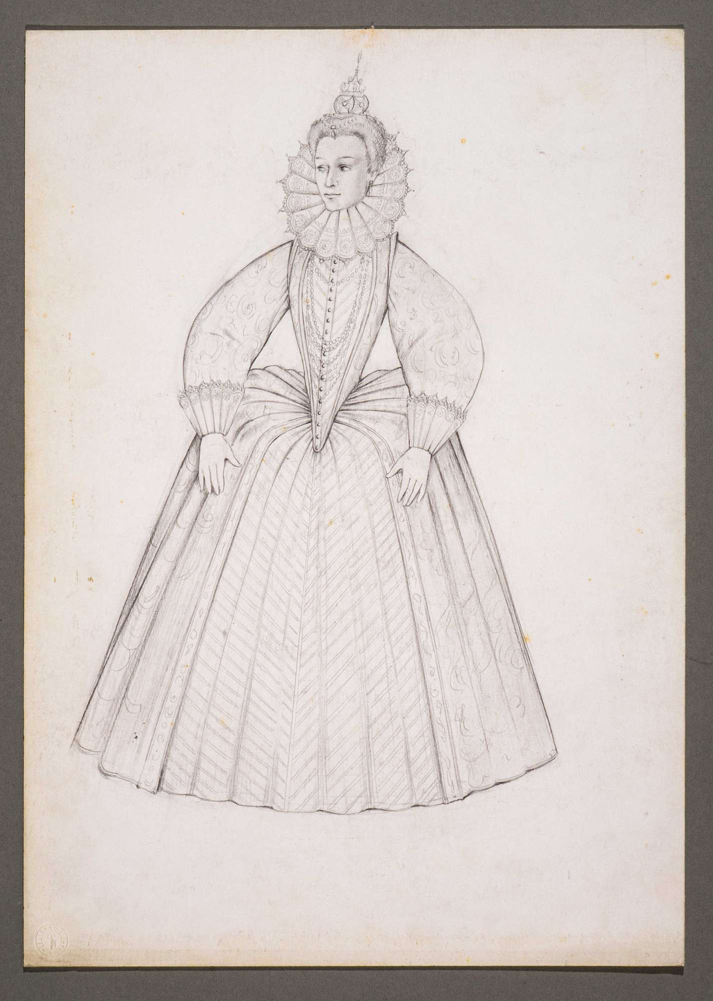 Il gioco dei potenti, libero adattamento di Giorgio Strehler da Enrico VI, dramma storico di William Shakespeare, in 15 atti e 2 giornate. Figura femminile in piedi di fronte, con il capo e lo sguardo leggermente girati verso sinistra. Nobile dama con abito ricco, costituito da collaretta in pizzo inamidato a gorgiera, corpetto a cono, maniche a prosciutto con alti polsini in pizzo, verdugale a ruota, alto diadema a punta sul capo, collane.