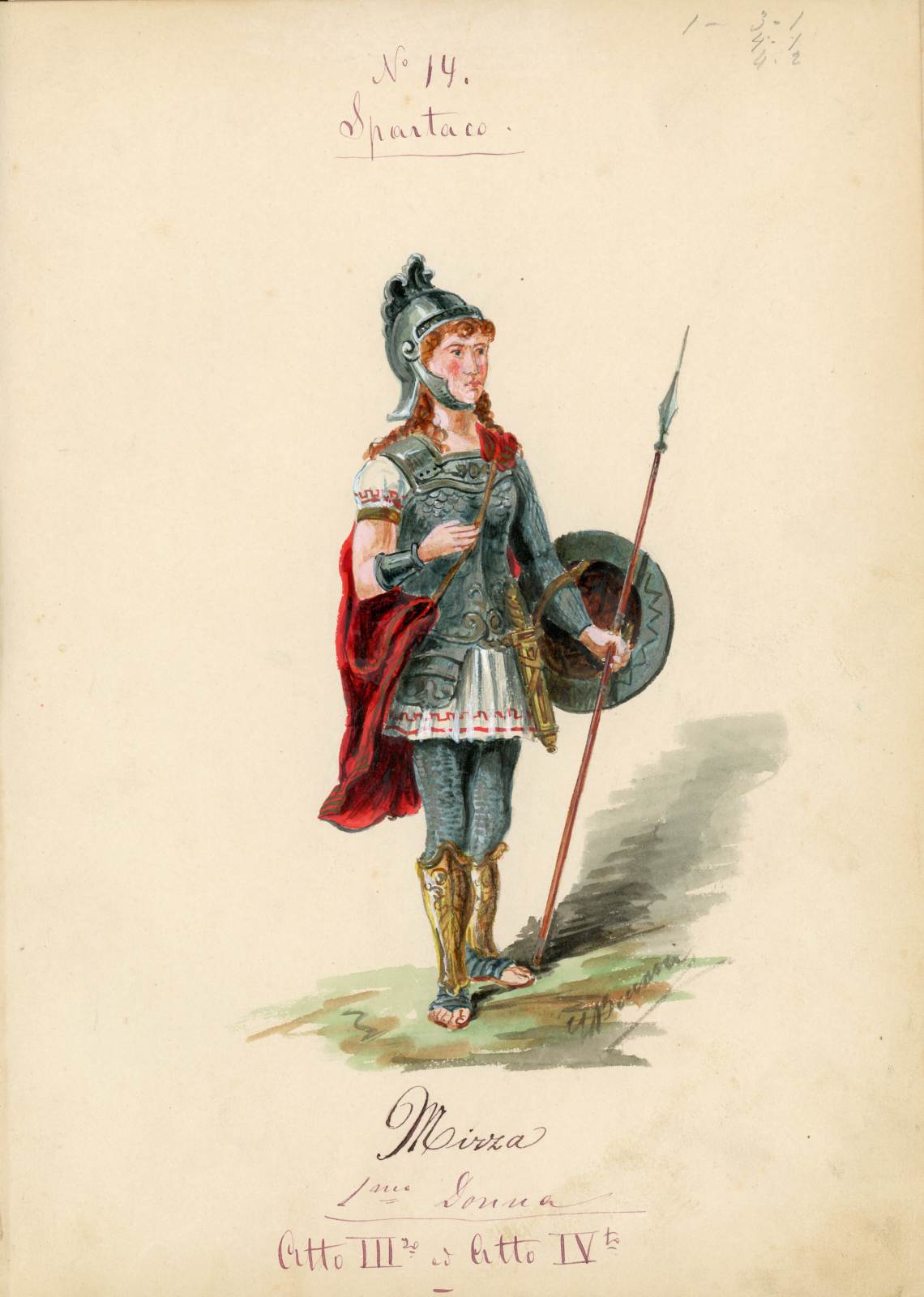 Spartaco, opera di Giuseppe Sinico. Figurino per il personaggio Mirza. Figura femminile intera di 3/4 in abiti militari maschili. Mantello rosso, elmo, lancia, scudo, corazza corta