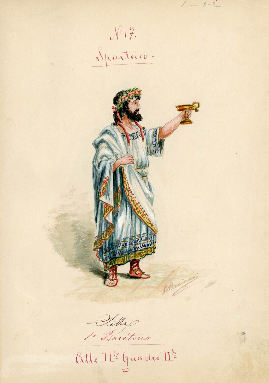Spartaco, opera di Giuseppe Sinico. Figurino per il personaggio Silla. Figura maschile intera di profilo, regge una coppa con la mano sinistra alzata. Toga orlata con decori giallo-rosso-blu. Corona di fiori sul capo, sandali rossi alti