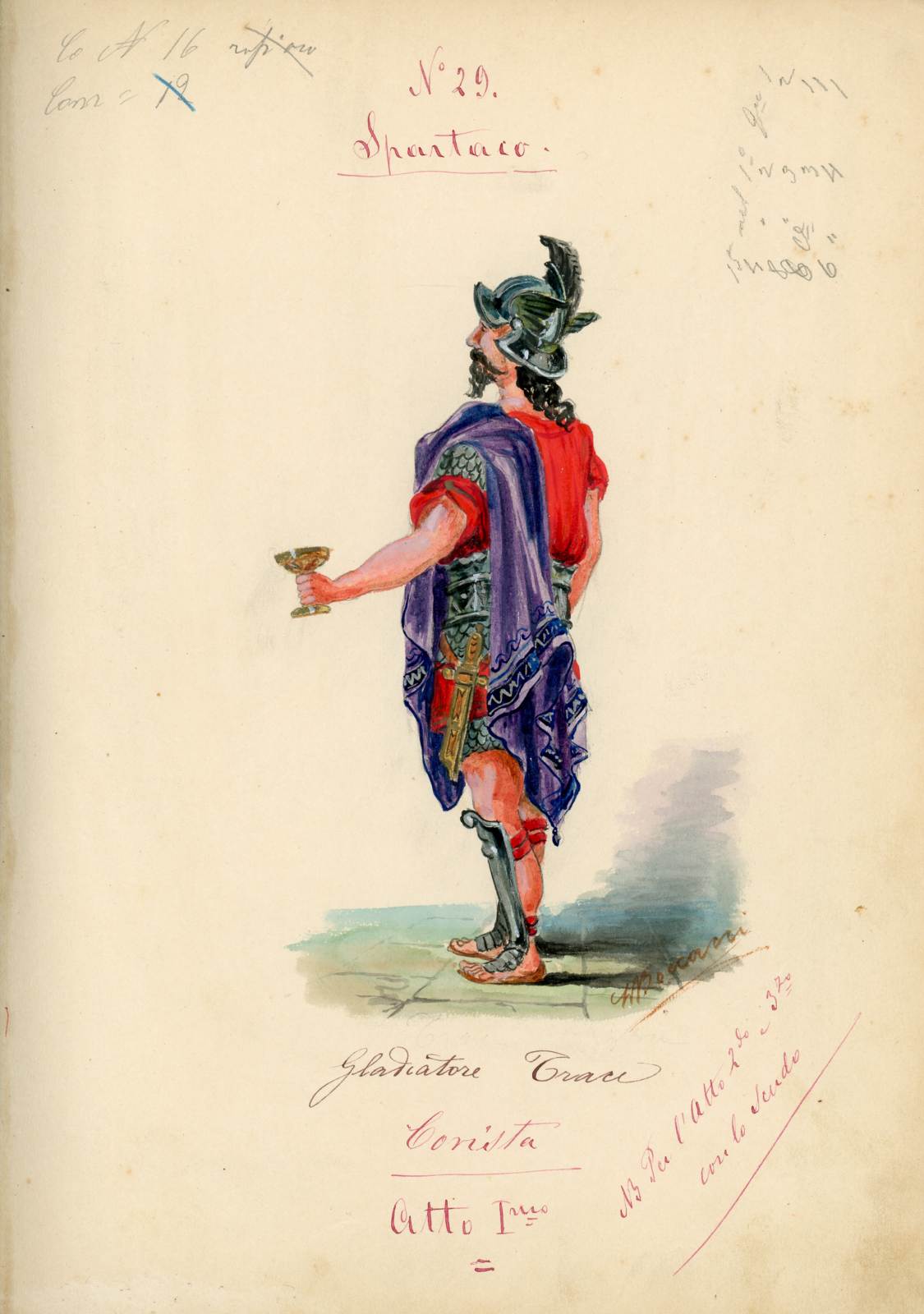 Spartaco, opera di Giuseppe Sinico. Figurino per il personaggio gladiatore trace. Figura maschile intera, girata di schiena di 3/4 in abbigliamento militare. Corta tunica rossa, corazza a squame, mantello viola, elmo alato sul capo, schinieri, coppa nella mano sinistra, gladio al fianco