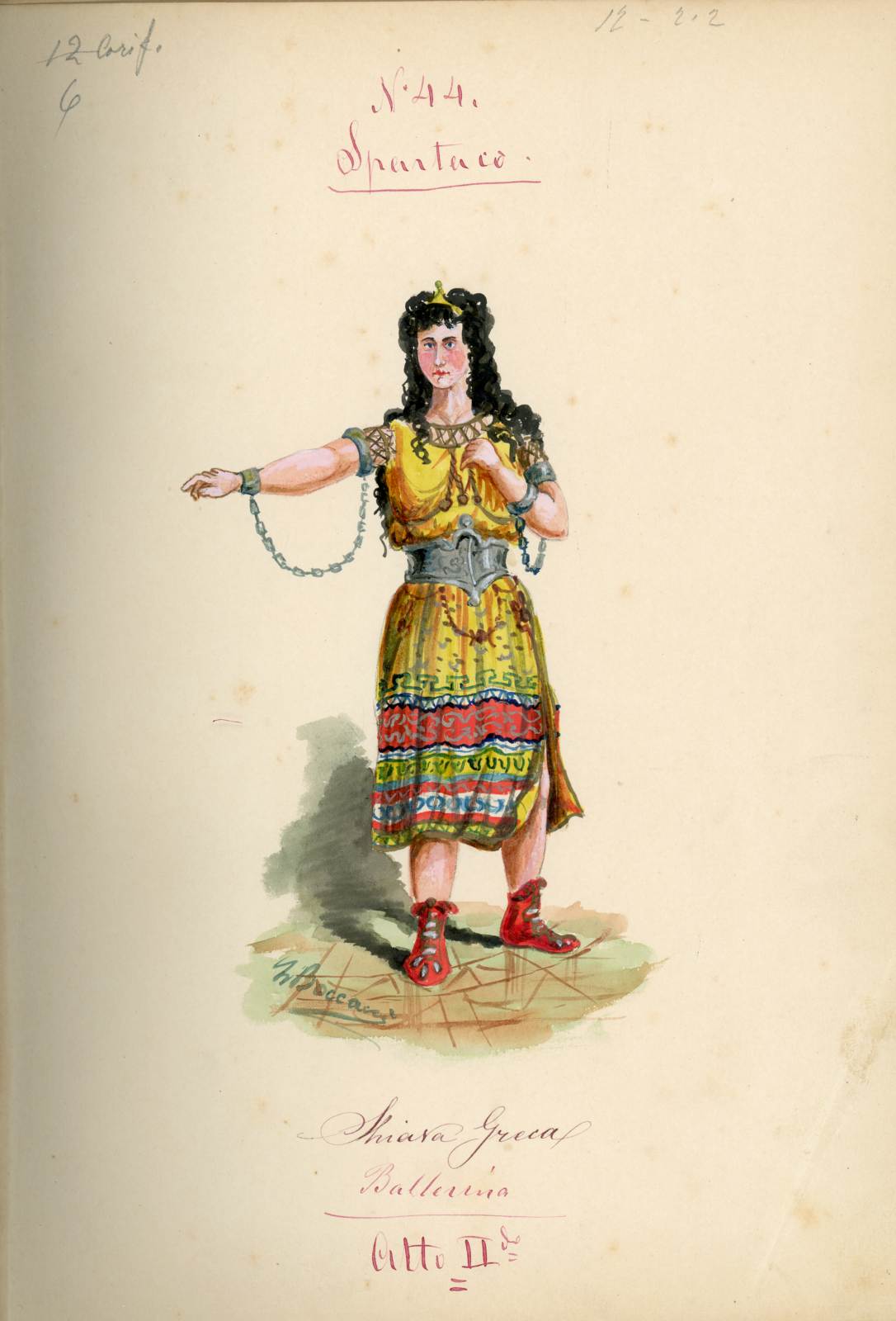 Spartaco, opera di Giuseppe Sinico. Figurino per una schiava greca. Figura femminile intera di fronte, con braccio destro alzato a angolo retto. Tunica gialla a decori variopinti, sandali rossi, catene alle braccia, diadema