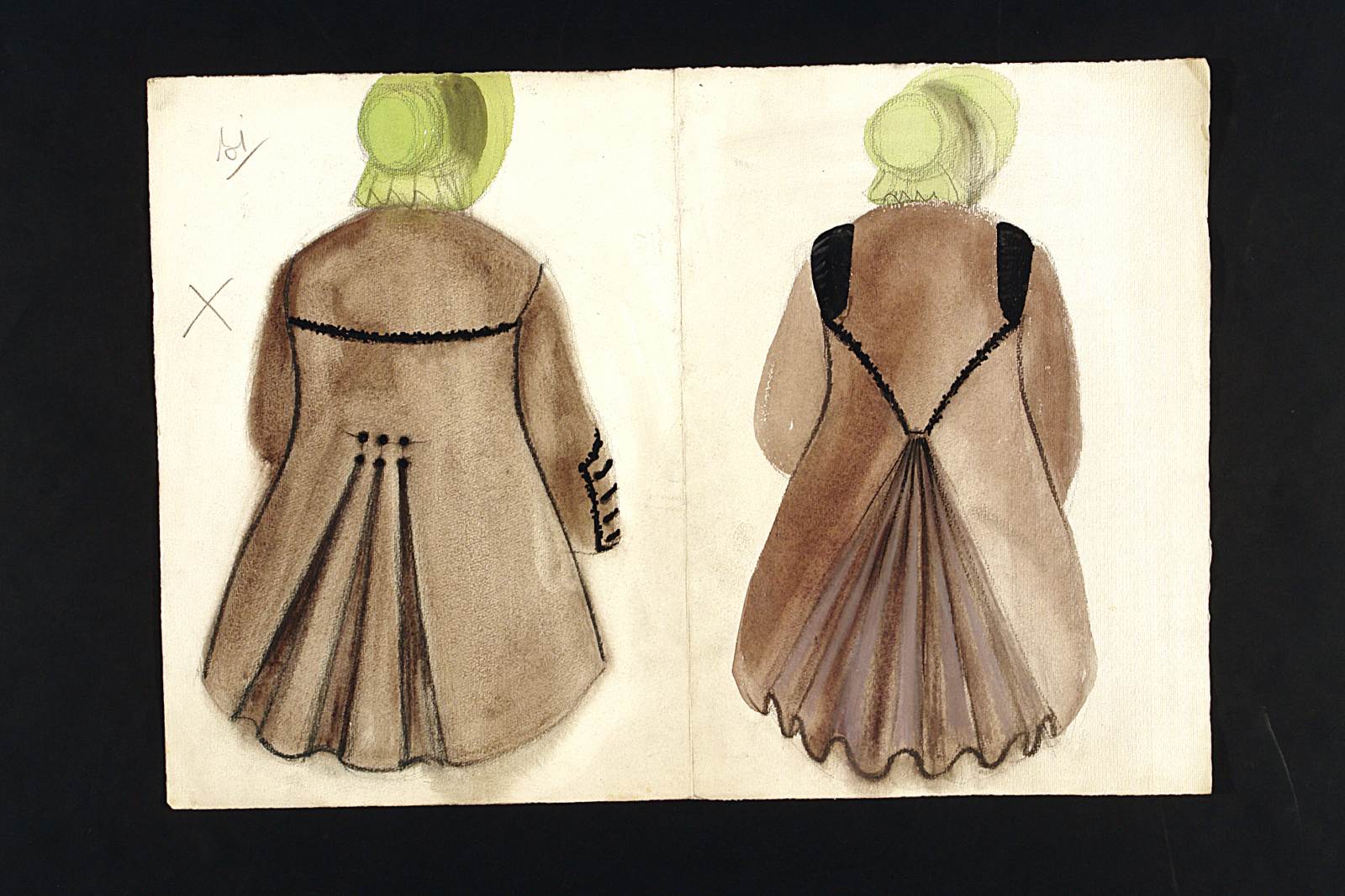 La cagnotte, testo teatrale di Eugène Labiche. Figurino per Léonida, 2 figure femminili non complete nella parte inferiore, viste da dietro. Medesimo cappotto di CMT_OA_4_000400 e CMT_OA_4_000401