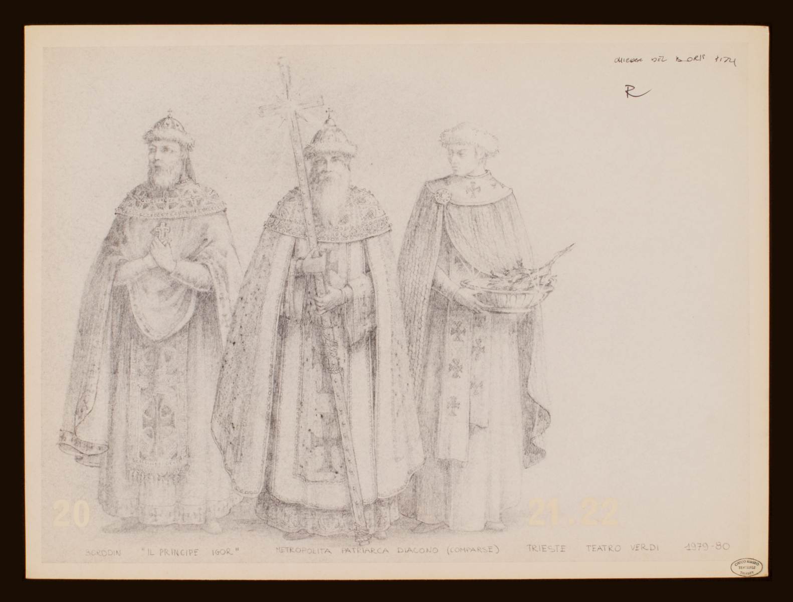 Il principe Igor, opera di Aleksandr Porfir'evič Borodin. Tre costumi per metropolita, patriarca, diacono ortodossi, tre figure del clero maschili intere. Figura di destra: copricapo bordato di pelliccia, abito, manto, stola a croci quadrate, regge in mano un'acquasantiera con ramoscello. La figura al centro e a sinistra: indossano come copricapo zuccotti a spicchi con croci romane ai vertici e bordi di pelliccia, abiti e mantello cerimoniale con pannelli crociati. La figura al centro reca in mano una grande croce processuale
