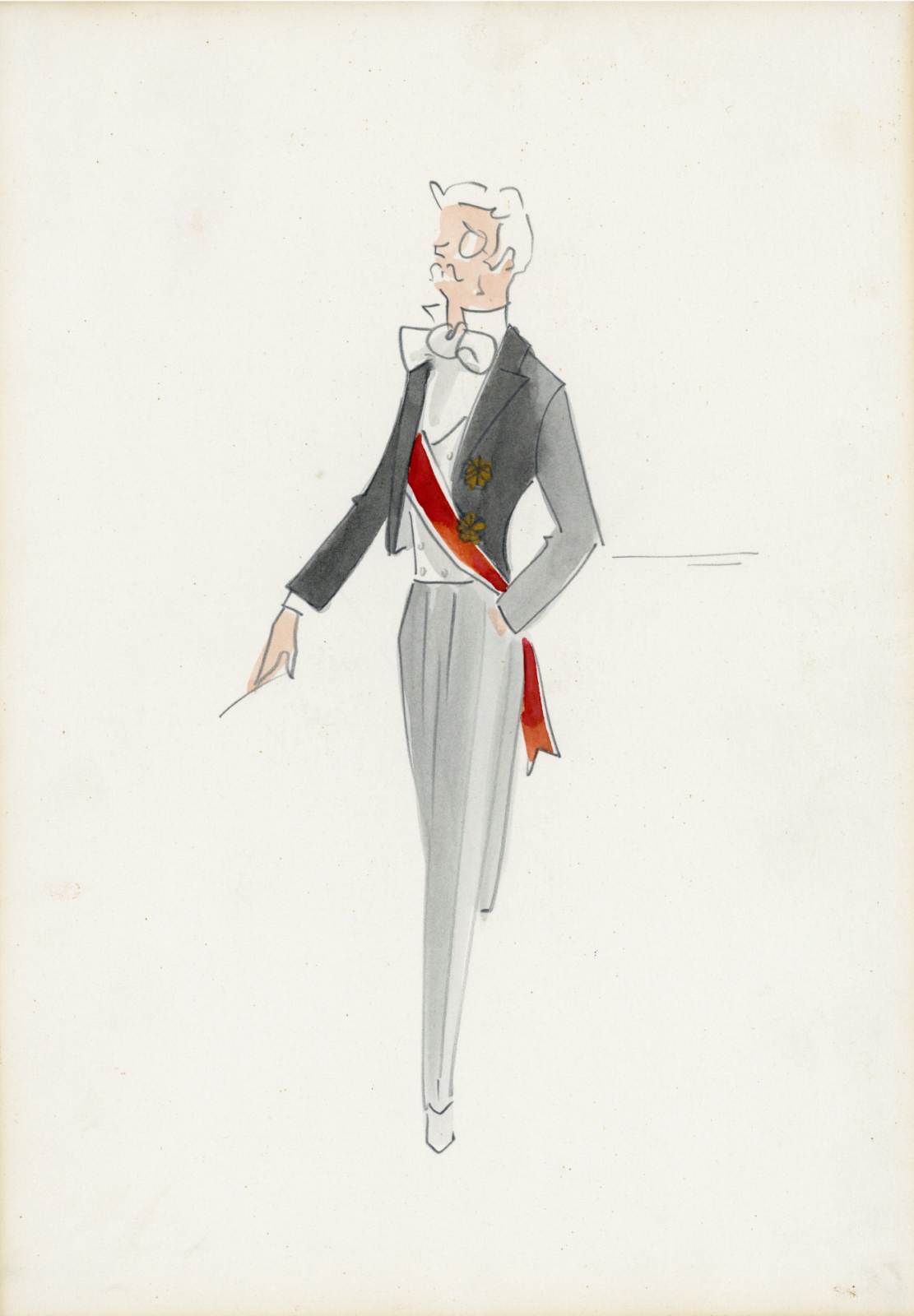 La vedova allegra, operetta di Franz Lehár, figura maschile in marsina, sparato bianco, cravatta a farfalla, gilet bianco a due file di bottoni, fascia traversa rossa, monocolo, decorazioni e onorificenze appuntate sulla giacca, scarpe grigie