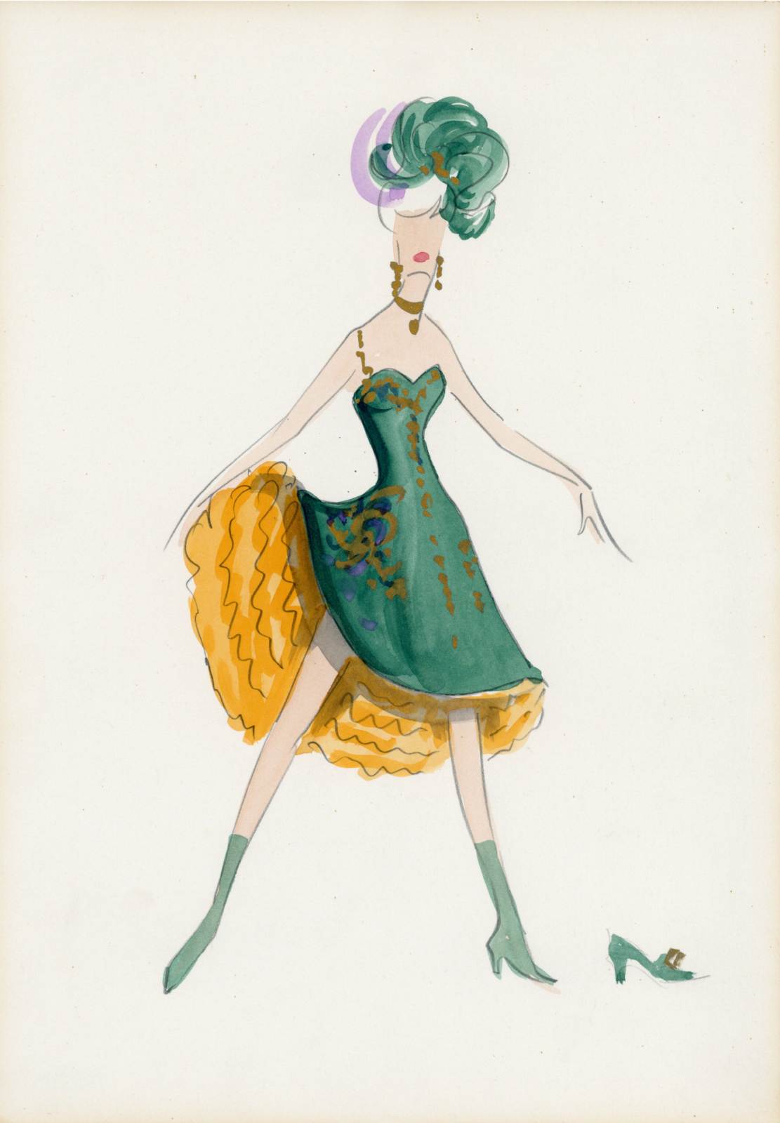 La vedova allegra, operetta di Franz Lehár, figura femminile in abito sbracciato verde e oro con ampia gonna al ginocchio a balze di pizzo, acconciatura con piume in testa, stivaletti verdi, gioielli al collo. A destra particolare di altra calzatura a sandalo con tacco e fibbia d'oro