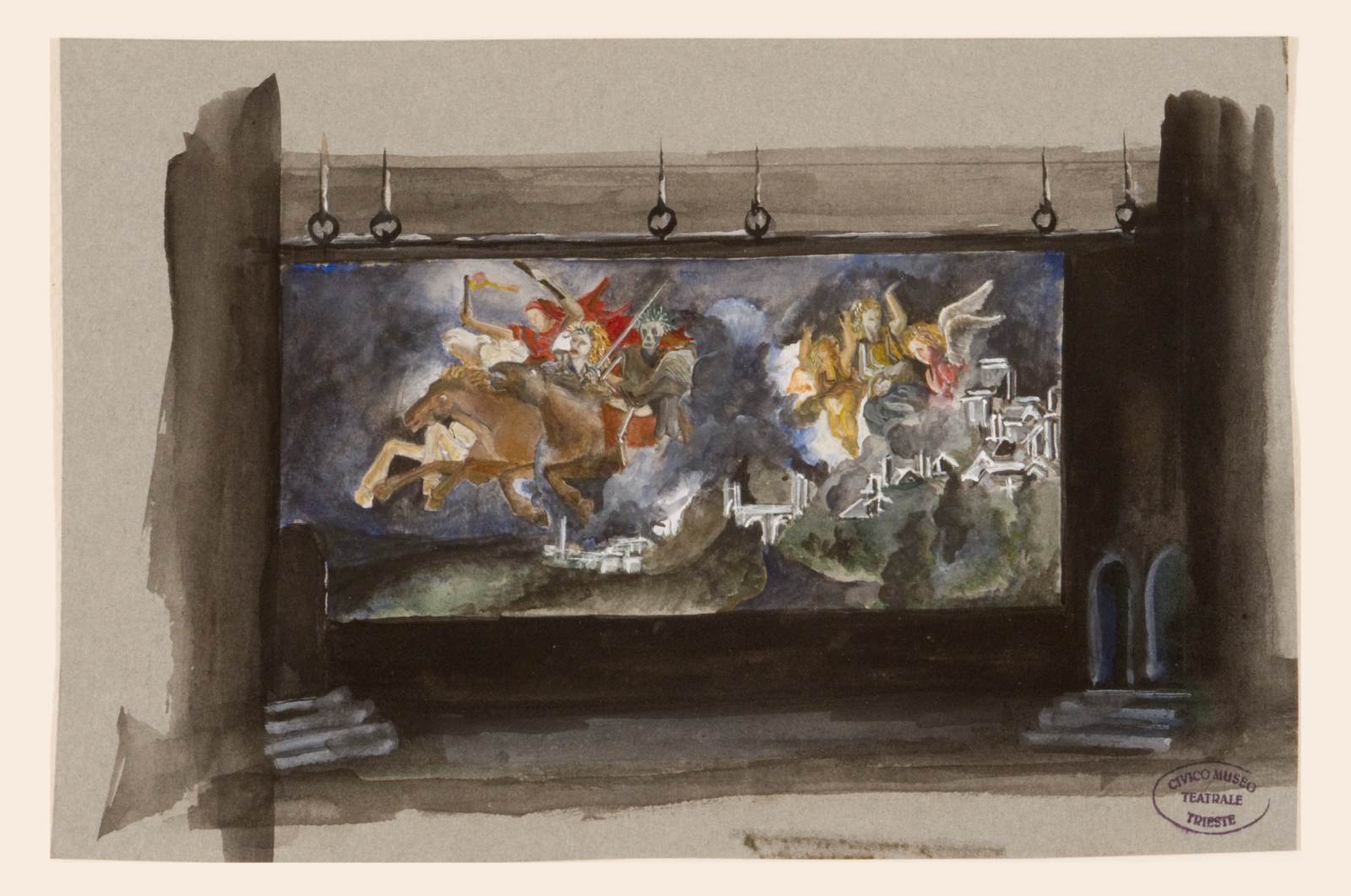 Suor Angelica, atto unico di Giacomo Puccini. Sala conventuale con scalini laterali, sullo sfondo fondale sospeso con grande rappresentazione biblica con angeli della morte