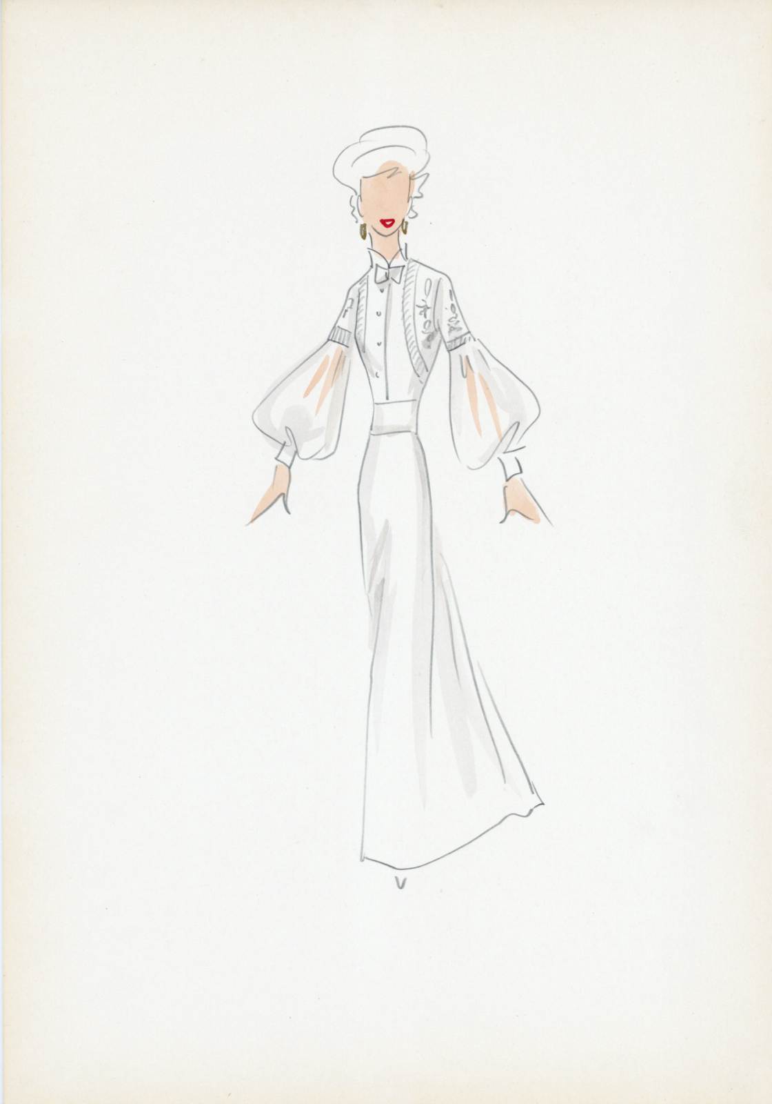 Sogno di un valzer, operetta di Oskar Strauss, costume femminile bianco da giorno, camicia accollata con maniche ampie a palloncino e trasparenti, giacchino sovrapposto, gonna svasata lunga, cappello, orecchini, fiocchetto al collo