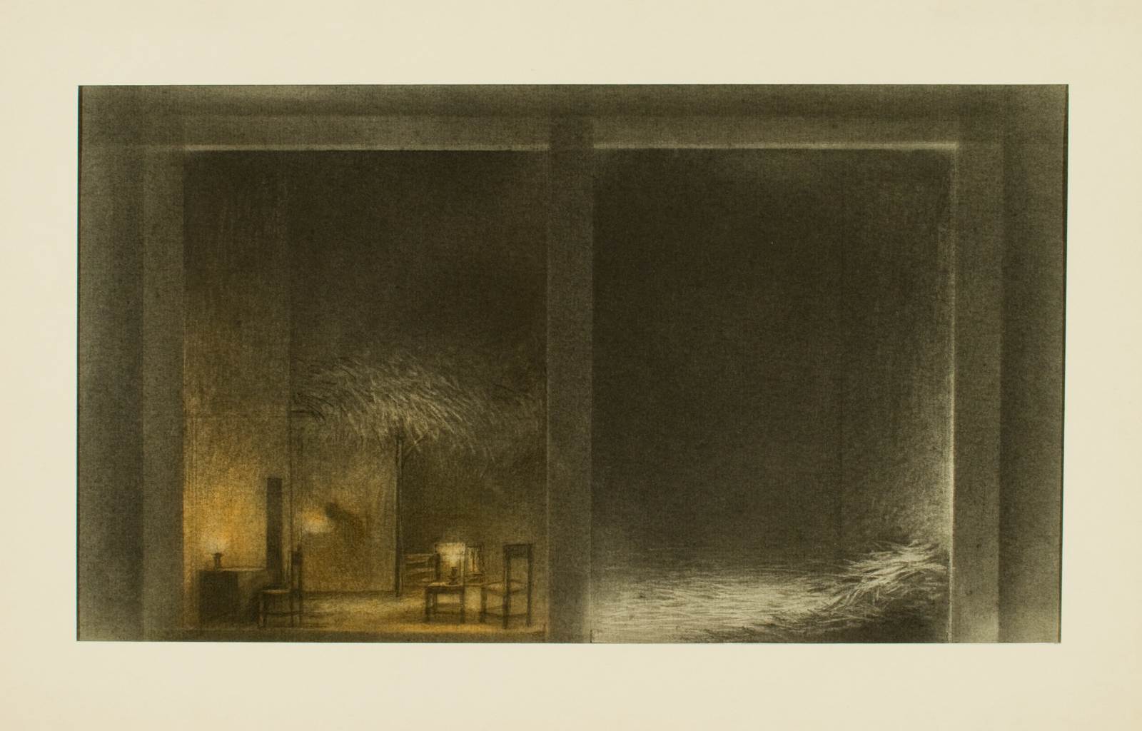 Rigoletto, opera di Giuseppe Verdi, atto 2. Interno di osteria di Sparafucile: scena dimezzata. A destra vano oscuro e vuoto; a sinistra sedie e mobile con figura seduta.