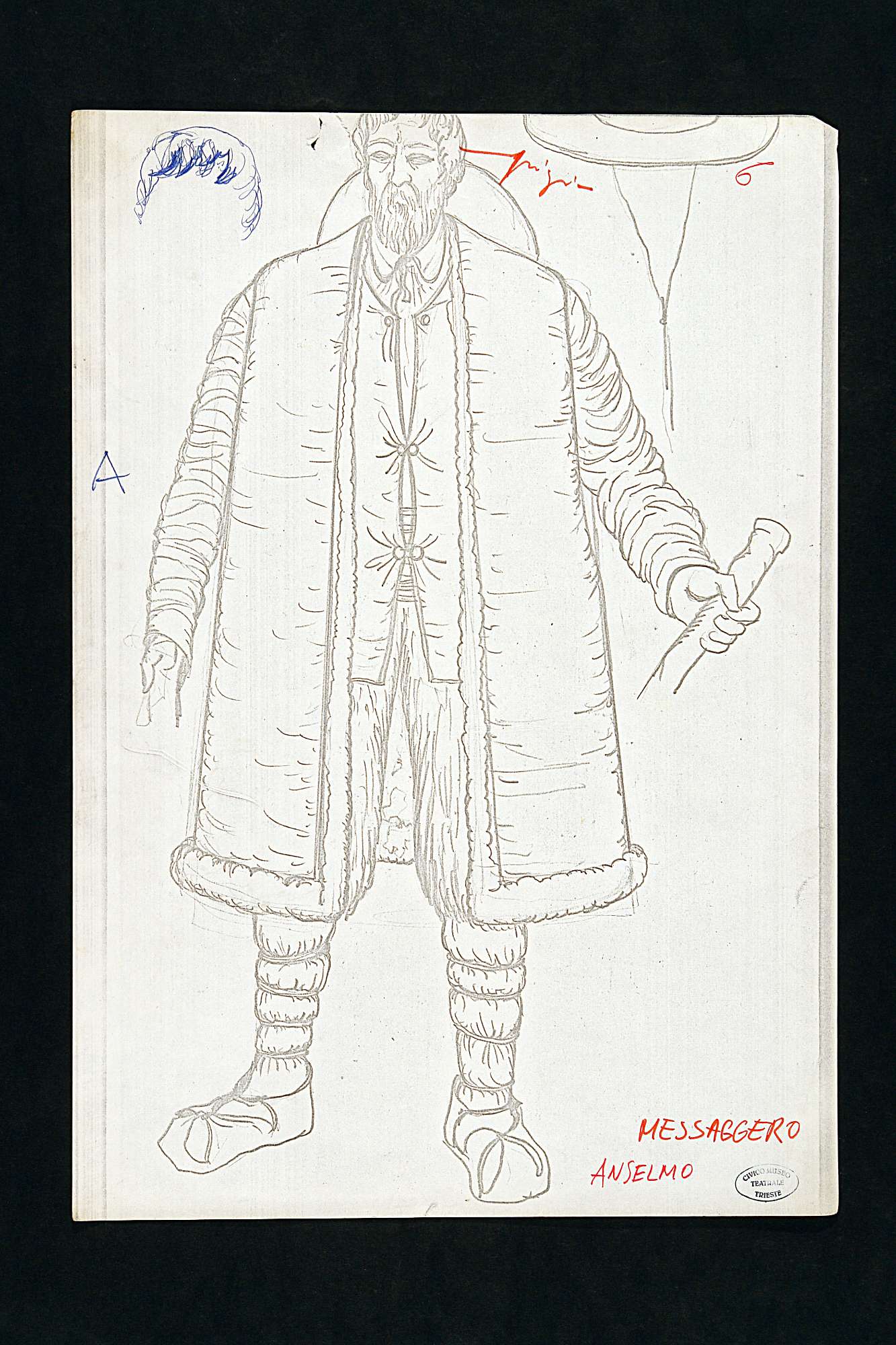 Edipo Re di Sofocle, figura maschile intera, messaggero Anselmo. Indossa cappello conico con ampia tesa circolar, camicia, giacca senza maniche chiusa centralmente con 3 alamari e 6 bottoni. Soprabito con interno di pelliccia, pantaloni al ginocchio, bastone, fascia alla vita, gambali trattenuti da legacci