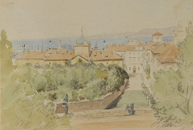Acquerello raffigurante una veduta di Trieste dal colle di San Vito con, in primo piano sulla sinistra, la villa Necker.