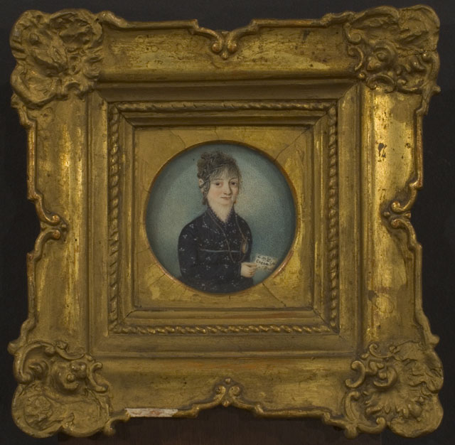 La miniatura offre un’effigie femminile a mezzo busto, tradizionalmente identificato come il ritratto di Maria Carbonetti, musicista 1800-1835. Non è stato possibile reperire altre informazioni sull’effigiata, che regge una lettera con un’iscrizione parzialmente leggibile. Il ritrattino presenta qualche sproporzione ed evidenti rigidità; opera modesta.