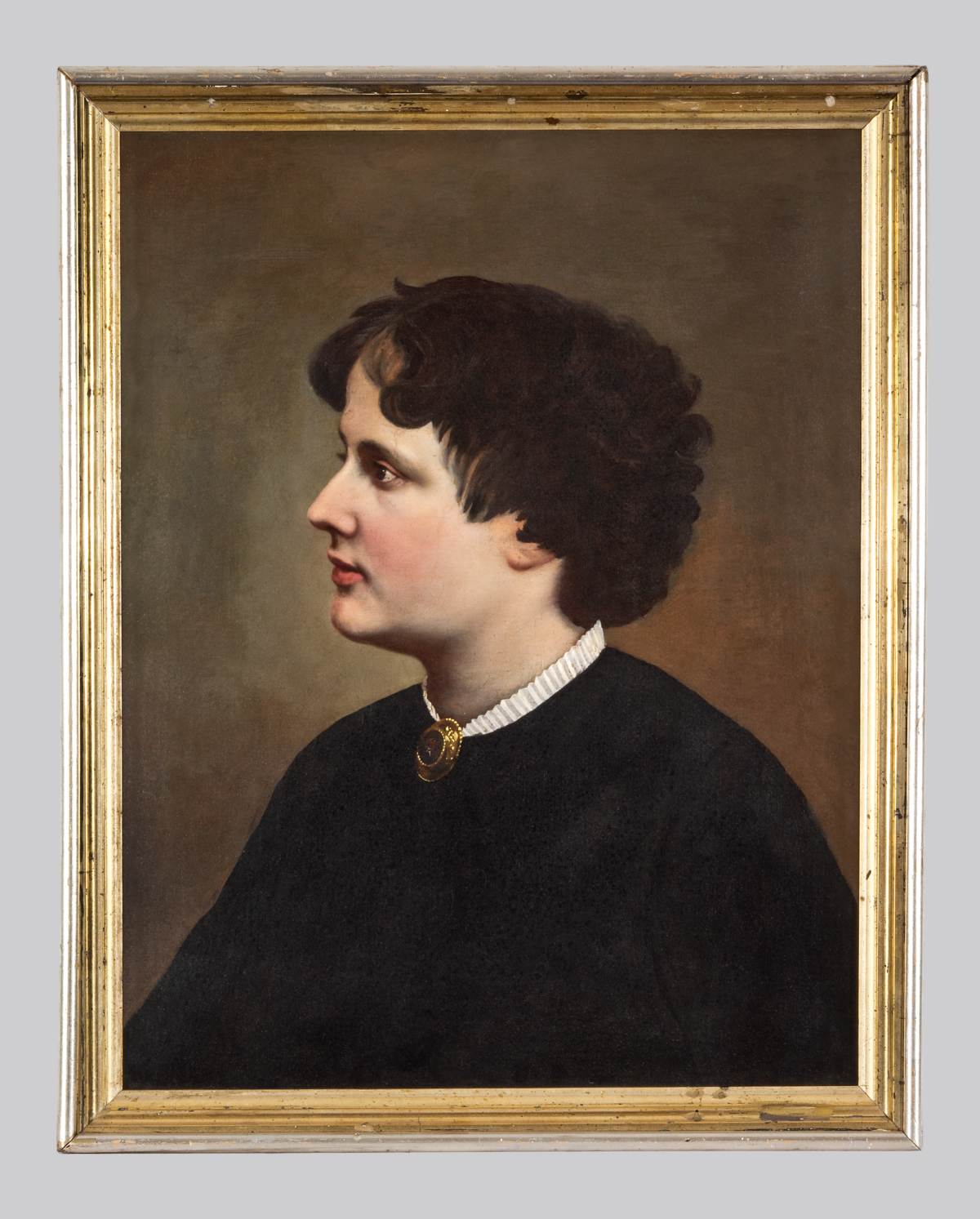 Carlotta Cavini ritratta da Beda, da giovane, a mezzo busto, di profilo e in una posa fortemente statica. La pennellata, in questo dipinto, risente fortemente dell'impostazione accademica. La donna indossa un vestito nero molto accollato dal quale sbuca un colletto bianco sul quale è appuntato un medaglione con cammeo.