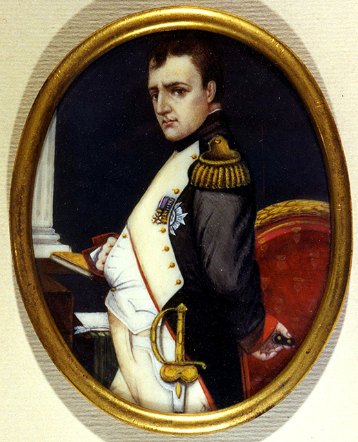 La miniatura ritrae Napoleone Bonaparte di tre quarti nel suo studio e deve essere messa in relazione con il dipinto di Paul Delaroche (Parigi, 1797-1856) noto con il titolo Napoleone nel suo studio, eseguito verso il 1837-38 (già Collezione Lady Sandwich; poi Sotheby’s New York, 26/05/1994, lotto 13). Questo venne tradotto in una stampa dall’incisore Leybold Johann Friedrich (Stoccarda, 1755-Vienna, 1838) e, nel 1841, da Louis Aristide (1815 ca.-1852 ante), cfr. stampa CMSA inv. SNR 1529.