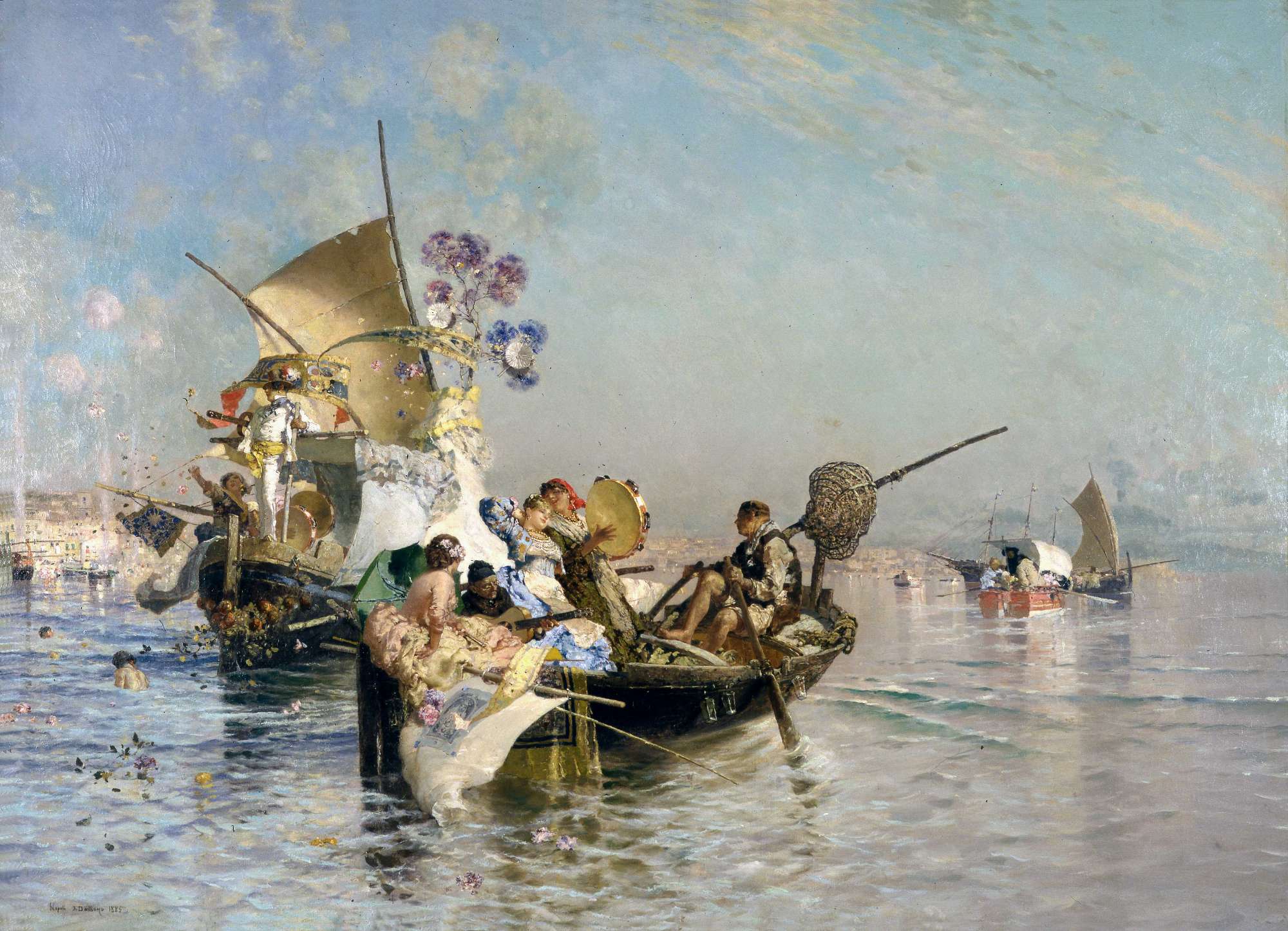 Dal momento in cui Alfredo Tominz divenne conservatore del Museo, gli sforzi del Curatorio per l'accrescimento della raccolta museale furono per lo più rivolti al completamento delle scuole regionali italiane ed all'incremento del nucleo degli artisti stranieri. Questa specifica linea d'azione perseguita dall'organo di gestione è documentata, in particolare, dal duplice acquisto effettuato alla vendita all'incanto promossa a Napoli dal principe di Sirignano (1901). In quell'occasione, infatti, prontamente colta dal Curatorio per la presenza di "autori di gran fama" (Verbale del Curatorio, 4 maggio 1901), la scelta individuò un artista italiano, Dalbono, ed uno austriaco, Makart. L'acquisto della Canzone nova di Eduardo Dalbono, tuttavia, fu preceduta da un interessante scambio epistolare tra il pittore napoletano ed il Tominz, quest'ultimo già interessato fin dall'89 ad entrare in possesso di un'opera dell'artista. Veniamo in tal modo a sapere che, nell'ottobre del 1889, egli chiedeva al Dalbono se avesse avuto disponibili dei "quadri simili a quello comparso su "L'Illustrazione Italiana" raffigurante il Golfo di Napoli" (Arch. del Museo Revoltella, 30 ottobre 1889). Il passo successivo lo si ricava da una lettera dell'artista al conservatore nella quale si tratta dell'invio di alcune fotografie relative alle sue opere (Arch. del Museo Revoltella, 18 novembre 1989). Ma l'opportunità per l'ulteriore incremento delle opere appartenenti alla scuola napoletana giunse soltanto con la vendita all'incanto del 1901. Avendo avuto notizia della presenza di un'opera del Dalbono si decise così di inviare il conservatore a Napoli con un mandato d'acquisto estensibile fino a 8.000 lire "impiegando il civanzo della fondazione Rossetti" (Verbale del Curatorio, 4 maggio 1901). Da una nota del Tominz si constata quindi l'avvenuta acquisizione (Arch. del Museo Rev., 4 giugno 1901), mentre da un documento di mano dello stesso, recante la medesima data, leggiamo dell'invito esteso al Curatorio a "prendere visione del dipinto acquistato all'incanto dal principe di Sirignano in Napoli". La somma impiegata per l'opera del Dalbono ammontava a 2.800 lire (Verb del Cur., 9 ottobre 1901). La consuetudine del pittore napoletano alla letteratura, alla poesia e alla cultura in senso lato, trasmessagli dal particolare clima familiare, non mancò mai di manifestarsi nei suoi dipinti. La lettura delle opere del padre Tito, letterato, "che ricordavano le usanze e i costumi popolari - contribuirono - ad accendere nel piccolo Eduardo il desiderio di illustrare con l'arte del disegno le belle e fantastiche tradizioni " (Maggiore, 1955). L'amore inesauribile per la solarità, la bellezza ed il folclore della città partenopea, si concretizzò in una serie di quadri di spirito e fattura analoga alla Canzone nova, come la famosa Tarantella, La pesca felice, La spiaggia di Mergellina ed altri ancora. L'allegra brigata in primo piano della Canzone nova, danza e canta sulle imbarcazioni dei pescatori addobbate per l'occasione, probabilmente la celebrazione della Vergine Assunta. La festa religiosa è accompagnata dal suono dei tamburelli e dall'immancabile mandolino e riunisce le barche in processione sulle acque tranquille del Golfo di Napoli, che si scorge in lontananza. Alle puntuali e realistiche notazioni dal vero degli arnesi da pesca, si accompagna il racconto fiabesco di una realtà trasfigurata da quel poeta-pittore che fu Dalbono. Tuttavia al pittore, al quale "nella magica rievocazione si è accoppiato un poeta non osiamo proprio rimproverare di non essersi sempre serbato scrupolosamente fedele alla realtà e di aver fatto tutto più luminoso, più luccicante, più bello o, per essere esatti, diversamente bello di come tutto viene dalla natura presentato" (Pica, "Emporium", 1901). Le frante, coloratissime pennellate che rendono simili i corpetti e le ampie sottane a festa delle donne alle ghirlande che cingono le prue delle barche e alle corolle sparse sulle onde del mare, denunciano la suggestione della pittura del Fortuny. Il maestro spagnolo non sembrò essere l'unica fonte ispiratrice per l'artista napoletano, nella resa di certi effetti atmosferici, così caratteristici delle opere di Dalbono: " [egli] crede di superare sè stesso se su mari d'albasia pone ampie vele aperte in piena luce o le allontana entro vapori rosei in effetti nei quali tenta di gareggiare con Turner, aspirazione di tutta la sua vita, rinnovando anche non so che di mitografismo rosiano con altro materiale, con le Sirene o con la casa di Masaniello." (Biancale, 1938). L'atmosfera gioiosa, incontenibile della scena viene trasmessa all'osservatore con altri espedienti ancora, consolidandosi nel sottostante mazzetto floreale, in legno dorato e intagliato, collocato sul bordo inferiore della cornice del quadro, a racchiudere lo stralcio di un pentagramma, sul quale sono forse annotate le parole poetiche del Di Giacomo sulle note di un'aria di Pasquale Costa (Arch. del Museo Rev., 8 febbraio 1960). Nelle raccolte poetiche del Di Giacomo, che conosceva ed amava le opere di Dalbono, un posto rilevante è occupato proprio dalle tante "canzoni nove", inneggianti, non diversamente dalle tele dell'amico pittore, la città di Napoli e la tanto adorata "napoletanità".