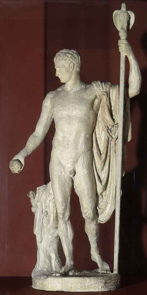 Il gesso è probabilmente un calco, ricavato da Canova stesso, del modellino in terracotta originale, oggi non più reperibile, per la statua colossale di Napoleone come Marte pacificatore, scolpita da Canova prima in marmo (1803-1806, Londra, Apsley House), quindi fusa in bronzo (1809, Milano, Brera). L’opera originale in marmo, alta quasi tre metri e mezzo, fu eseguita tra il 1803 e il 1806, in seguito alla commissione di un ritratto da parte dell’imperatore (1802). Secondo il Cicognara, Canova trasse ispirazione da un atleta ellenistico degli Uffizi, ma non è da escludersi un richiamo all’imperatore Augusto, portatore di pace dopo una fase di guerre civili. Il modellino potrebbe essere stato eseguito tra il 1802 e il 1803, dato che il modello grande fu esposto nello studio nel luglio 1803. Quando la statua fu portata a Parigi nel 1811, Napoleone, che non gradiva di essere raffigurato ignudo, decise di non consentirne l’esposizione al pubblico e di depositarlo nei magazzini del Louvre. Il marmo fu acquistato dal governo inglese nel 1815 e poi donato a Lord Wellington, il vincitore di Waterloo, che lo collocò nella sua casa di Londra. La versione in bronzo fu commissionata a Canova nel 1807 dal viceré d’Italia Eugenio e giunse a Milano nel 1812. Dopo varie vicissitudini nel 1859 trovò collocazione nel cortile dell’Accademia di Belle Arti. Il bozzetto in gesso del Revoltella fu ceduto al Museo dagli eredi dell’architetto Pietro Nobile, al quale era passato in proprietà dal barone Angelo Calafati, nominato nel 1813 intendente di Trieste e dell’Istria. Già nell’Ottocento sul gesso venne steso uno strato di pittura color avorio con lo scopo di fare assumere al modellino l’aspetto del marmo e di nascondere le tracce di colore rossastro lasciate dalla terracotta sulla quale era stato eseguito il calco. Anche l’esecuzione di una riproduzione in bronzo (pure nelle collezioni del Museo Revoltella) ha compromesso senz’altro la conservazione del pezzo.