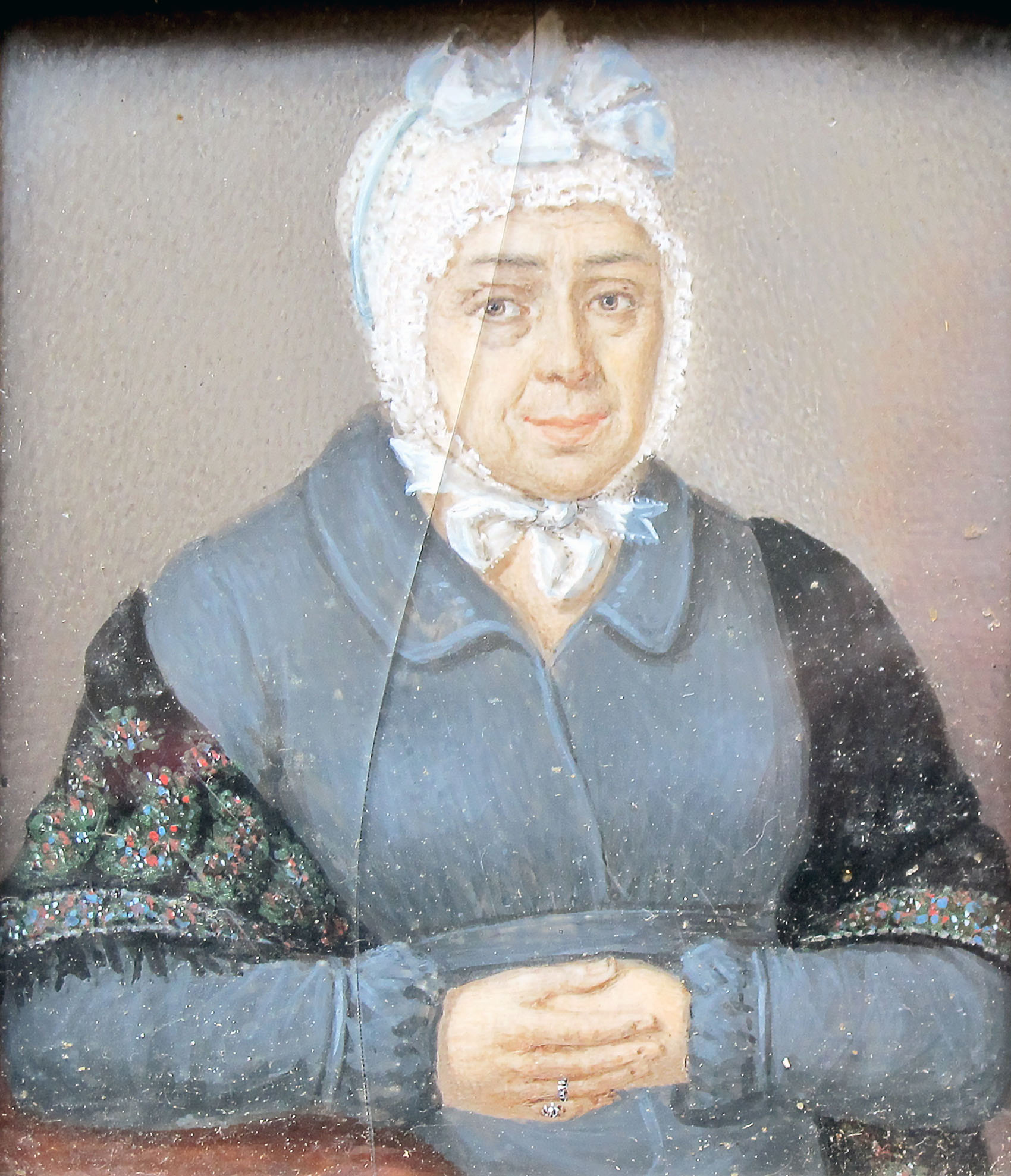 La donna non più giovane, ritratta in un interno, indossa un abito grigio blu, uno scialle nero con dei ricami colorati e porta una cuffia sul capo. L’iscrizione sul retro della cornice consente di identificare il personaggio raffigurato in Teresa Clementini, moglie di Paolo Freri detto Ferreri, effigiato nella miniatura inv. 13/5218. L'autore di questa miniatura non è stato identificato ma l’abbigliamento consente di circoscriverne l’esecuzione verosimilmente verso gli inizi del XIX secolo.