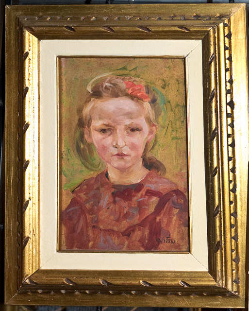 Ritratto di bambina con veste rossa e fiore sui capelli