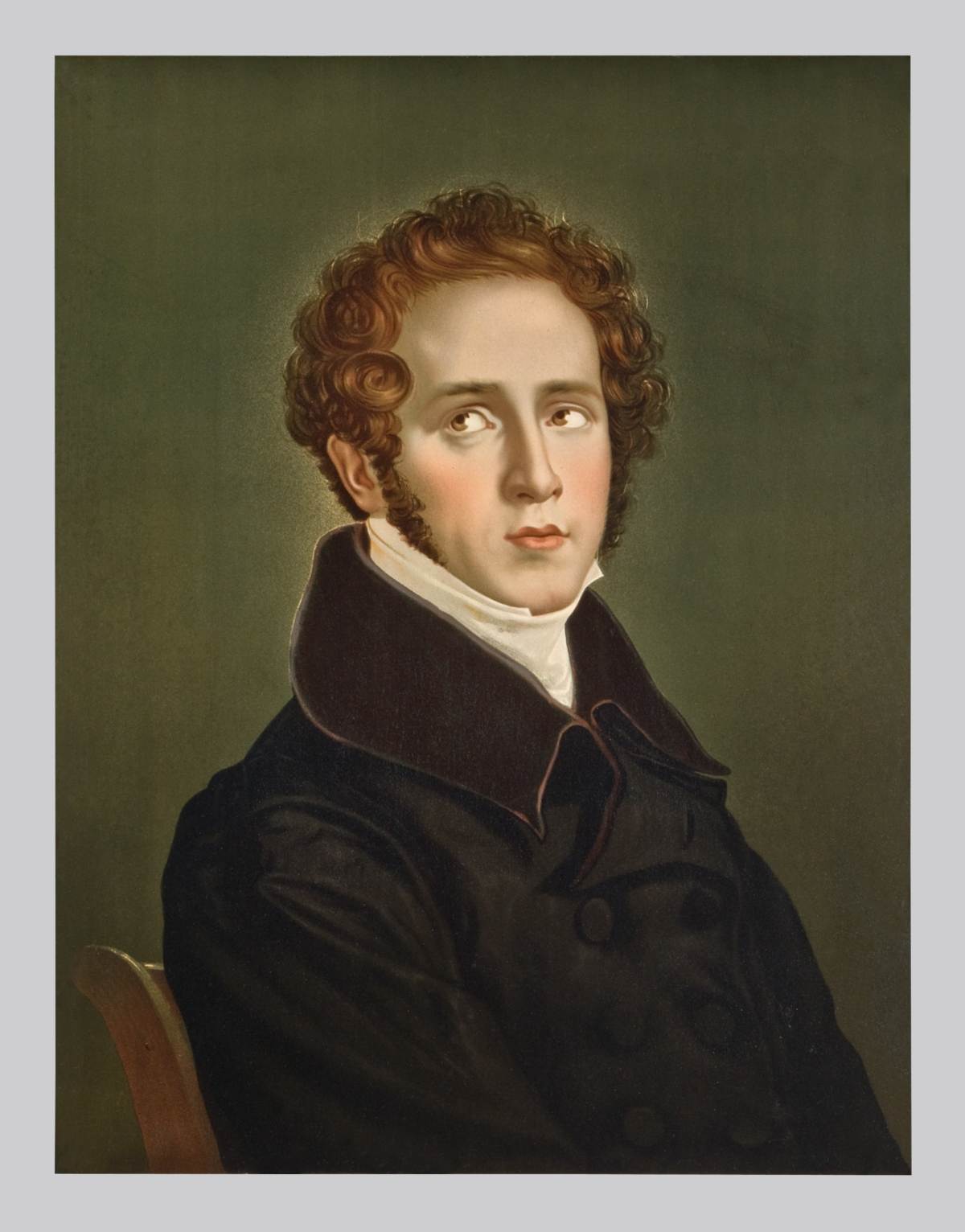 Il compositore è ritratto di mezzo busto, il corpo ruotato verso sinistra e il volto ripreso di fronte. Indossa un cappotto marrone chiuso e una dolcevita bianca.