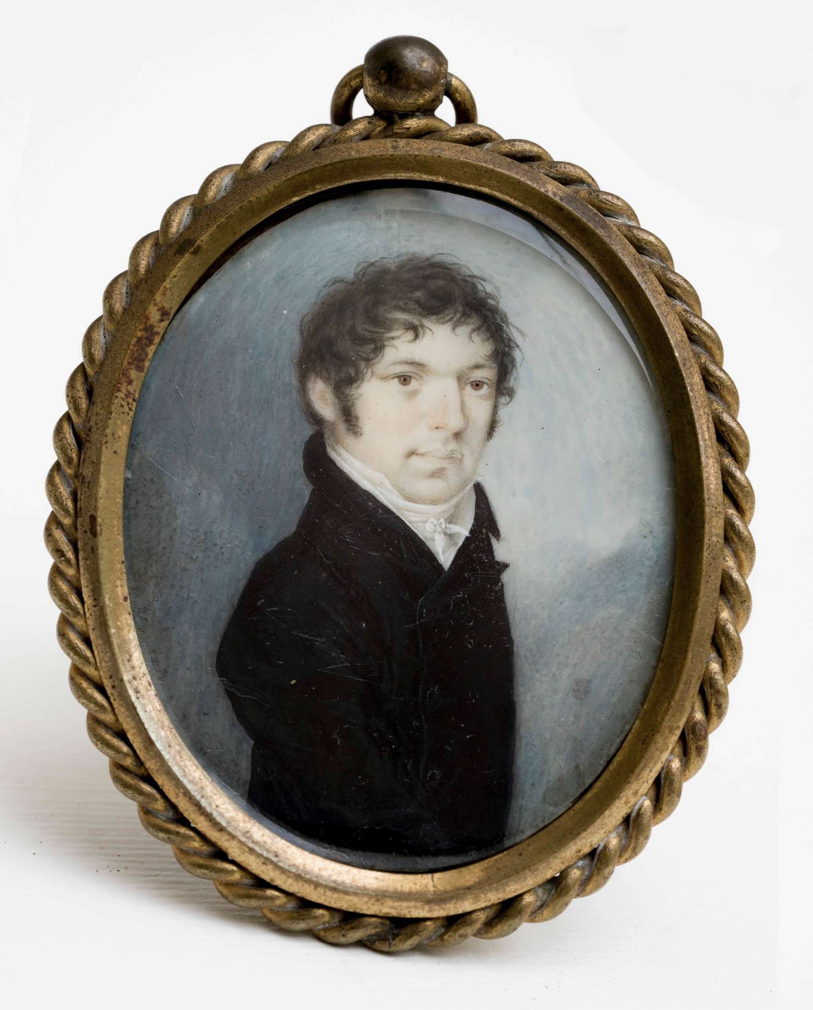 Non è stato possibile identificare l’effigiato di questa miniatura, pervenuta nelle collezioni civiche attraverso il legato Rusconi-Opuich. L'uomo indossa una marsina scura, e al di sotto camicia e cravatta bianche. Un’iscrizione (nella precedente schedatura è stata tradotta: "Opera del famoso pittore tedesco Gauermann") attribuisce l’opera al pittore tedesco Gauermann, come è stata finora inventariata.