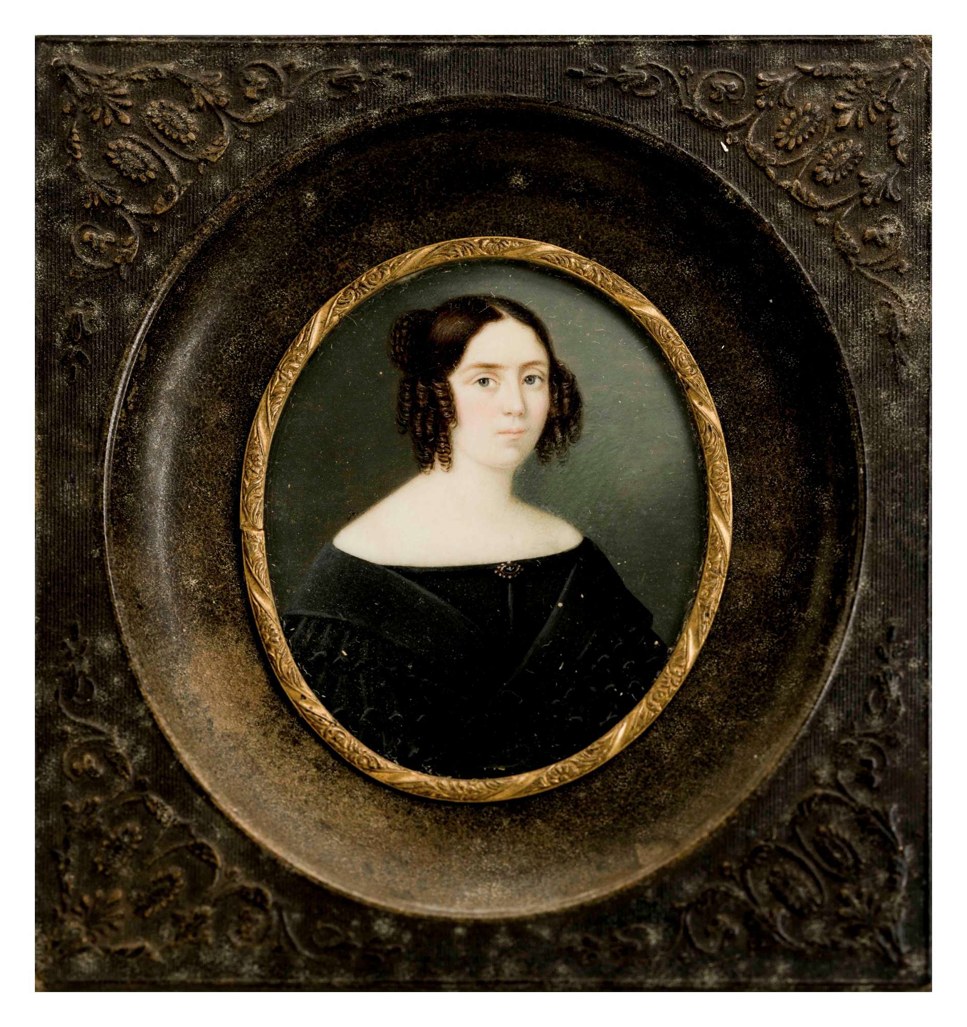 La miniatura, entrata nelle collezioni museali nel 1976 attraverso il legato Rusconi-Opuich, offre il ritratto di una giovane donna, che indossa un abito scuro con ampio scollo, al centro del quale è appuntata una spilla e con i capelli arricciati ai lati e raccolti sulla sommità del capo in una treccia. Tali elementi di costume hanno indirizzato una datazione verso il 1840.