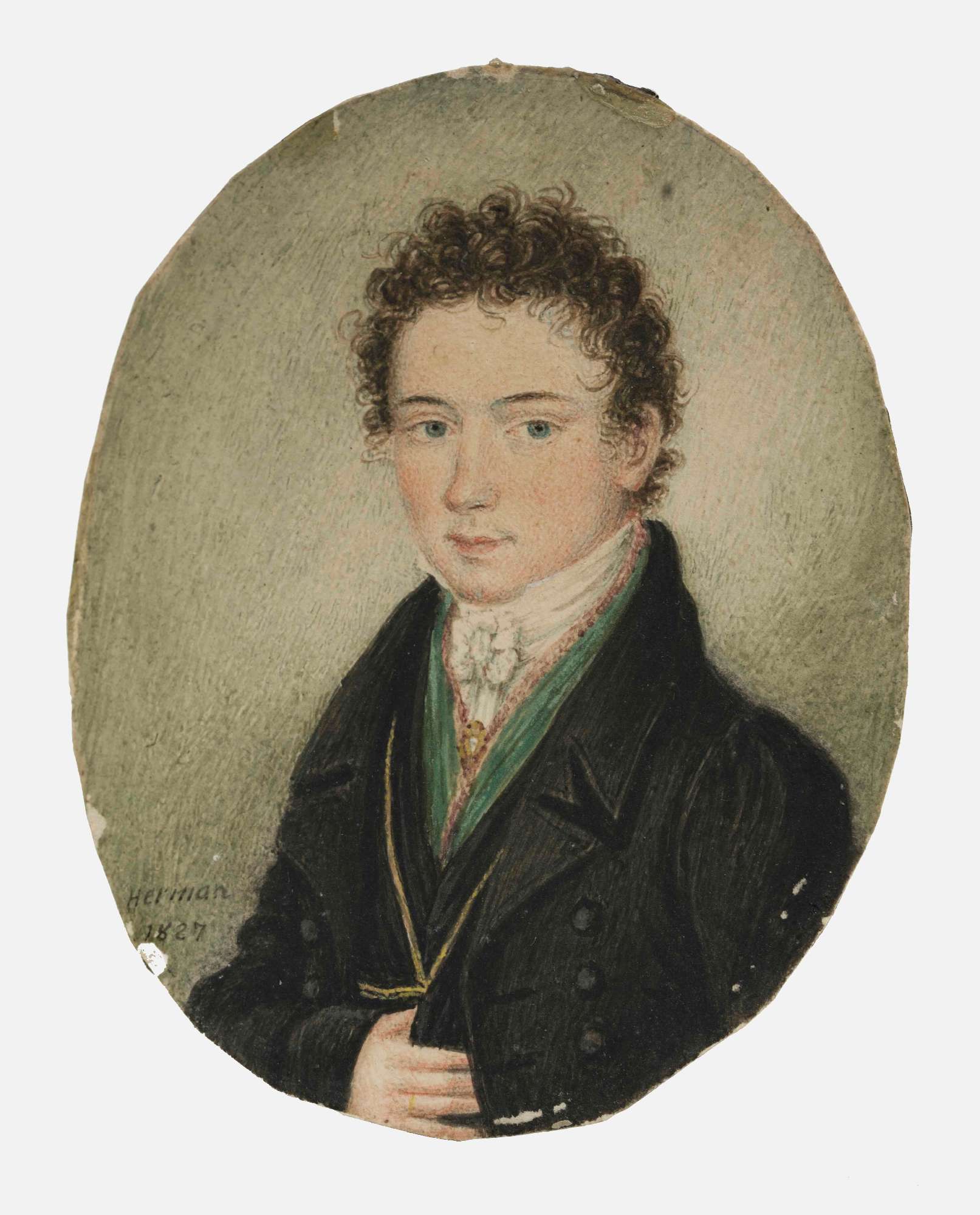 Miniatura di formato ovale che ritrae un giovane uomo, rivolto di tre quarti verso sinistra, vestito con marsina a doppio petto e sotto-marsina neri, panciotto verde, camicia bianca e alta cravatta. Il volto, contornato da capelli ricci, è tratteggiato in modo realistico; lo sguardo, frontale, sembra rivolto a un punto indefinito. La miniatura, per la firma, è ascrivibile a Herman, miniaturista di secondo ordine, secondo Schidlof, attivo tra il 1820 e il 1840, i cui volti appaiono un po’ assenti (Schidlof 1964, I, p. 350). A tergo della cornice, etichetta del commerciante Andreas Kaut di Monaco di Baviera.