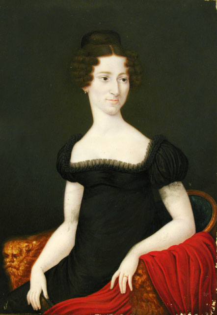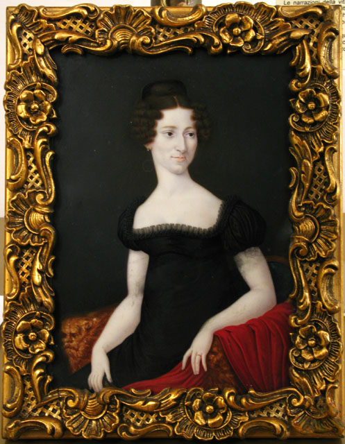 In questa miniatura Maria Margherita de’ Zanchi (Trieste, 1776-1863) sfoggia un abito stile impero, confezionato in velluto nero, che si caratterizza per la tipica vita segnata alta, appena sotto il seno, e le corte maniche a palloncino. Attorno all'ampio scollo quadrato è inoltre applicato un piccolissimo volant in pizzo che incornicia il décolleté. La baronessa è seduta su una poltrona a pozzetto con protomi leonine a guisa di braccioli, sulla quale è poggiato uno scialle rosso. La foggia dell’abito e l’acconciatura consentono di datare l’opera al secondo decennio del XIX secolo. Della contessa nelle collezioni del Civici Musei di Storia ed Arte si conservano altre effigi, cfr. inv. 13/4883, 13/4884 e 13/4893.