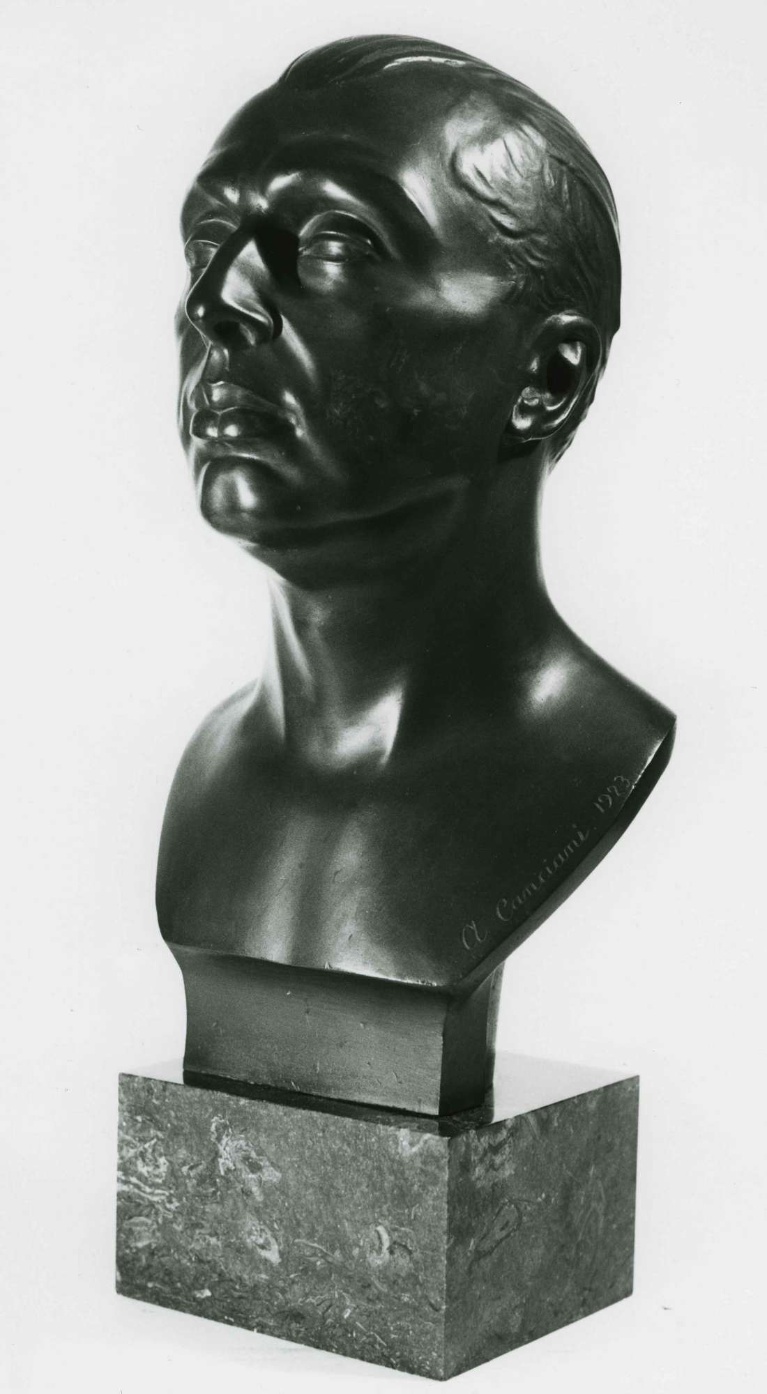 Lo scultore Canciani e il pittore Levier ebbero certamente un lungo rapporto d’amicizia, benché le loro vite, almeno in gioventù, si fossero svolte in luoghi diversi. Ne sono testimonianza significativa due ritratti di Canciani eseguiti da Levier a molta distanza di tempo, il primo (ora dei Musei provinciali di Gorizia) eseguito probabilmente a Vienna già intorno al 1902 (raffigura sullo sfondo un particolare del Dante), il secondo fatto a Trieste oltre trent’anni dopo, nel 1934. In mezzo c’è questo busto in bronzo del pittore, realizzato da Canciani nel 1923 – quando entrambi gli artisti si erano da pochi anni stabiliti a Trieste dopo lunghi soggiorni all’estero – ed esposto con successo alla Prima esposizione goriziana di Belle Arti nel 1924. Secondo la Da Nova «l’opera si colloca in una generale tendenza internazionale, dopo la crisi dello slancio curvilineo dello Jugendstil, di ripresa dell’ideale classicista», come d’altra parte aveva intuito anche Antonio Morassi presentando l’autore nel 1924 e osservando che l’opera rappresentava un nuovo orientamento «verso tendenze di semplicità, chiarezza, monumentalità, in una parola di sintesi...», così come esprimeva la «volontà di ridare alla figurazione plastica la sua struttura architettonica originaria». Levier morì ottantenne nel 1953, due anni prima di Canciani. Sulla sua tomba fu collocata una copia di questo busto, che il Museo Revoltella aveva acquistato nel 1932.