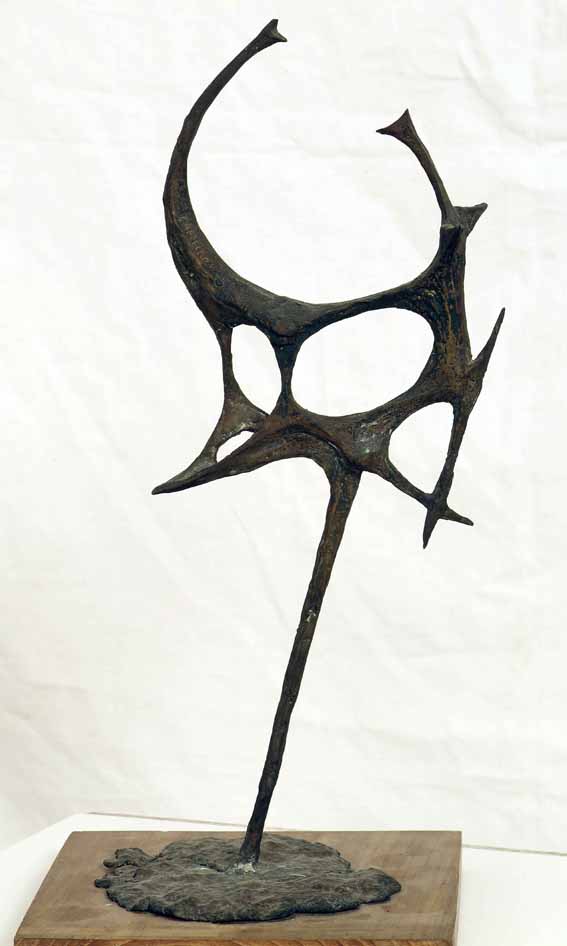 Eseguito nel 1957, il bronzo in esame è stato presentato alla Biennale di Venezia dell’anno seguente, dove Cappello ha esposto in una sala personale venticinque lavori, tra bronzi e disegni, quasi tutti risalenti al biennio 1957-58, e ha ricevuto il Premio Internazionale d’Arte Liturgica. Nella stessa occasione l’opera è stata acquistata dal Museo Revoltella, che, grazie alla contrattazione diretta tra gli autori e Marcello Mascherini, si è aggiudicato ad un prezzo di favore anche le sculture di Alberto Viani, Nino Franchina e Mario Negri. Nel catalogo dell’esposizione veneziana il critico Dino Formaggio ha sottolineato la capacità dell’autore di uscire dall’antinomia tra realismo e astrattismo «con un suo mondo, colto sugli scatti felici del reale e inarcato in ritmi, in rapidi voli di gesti conchiusi, di linee spezzate, dove è sempre presente, in aria e in luce, la intuizione di un significato». Anche Frank Popper, presentando la personale dell’artista alla Galleria Hervè di Parigi nel 1957, aveva parlato di una sorta di intuizione, di un istinto creativo primordiale che Cappello aveva iscritto «in un movimento purificato e gioioso». Uomo con gallo è un pezzo emblematico di questa fase della produzione di Cappello, per l’essenzialità lineare e per la tensione dinamica delle forme che, pur essendo ancora legate al dato naturalistico, si avvicinano alla plastica informale di Moore, visto alla Biennale di Venezia del 1948, e dei contemporanei artisti inglesi, come Butler, Chadwick e Armitage. Negli anni Cinquanta, quando abbandona la statuaria tradizionale per una più libera interpretazione del rapporto tra le forme plastiche e lo spazio, l’artista tratta spesso la figura umana e quella animale, mettendo in risalto il movimento dei corpi attraverso i profili fluidi e scattanti. Al 1954 risale un altro Uomo col gallo, esposto alla Galleria d’arte moderna Falsetti di Focette (Pietrasanta) nel 1974, che anticipa per alcuni aspetti l’opera del Revoltella, ma è caratterizzato da una maggior pienezza dei volumi e da contorni più sinuosi.
