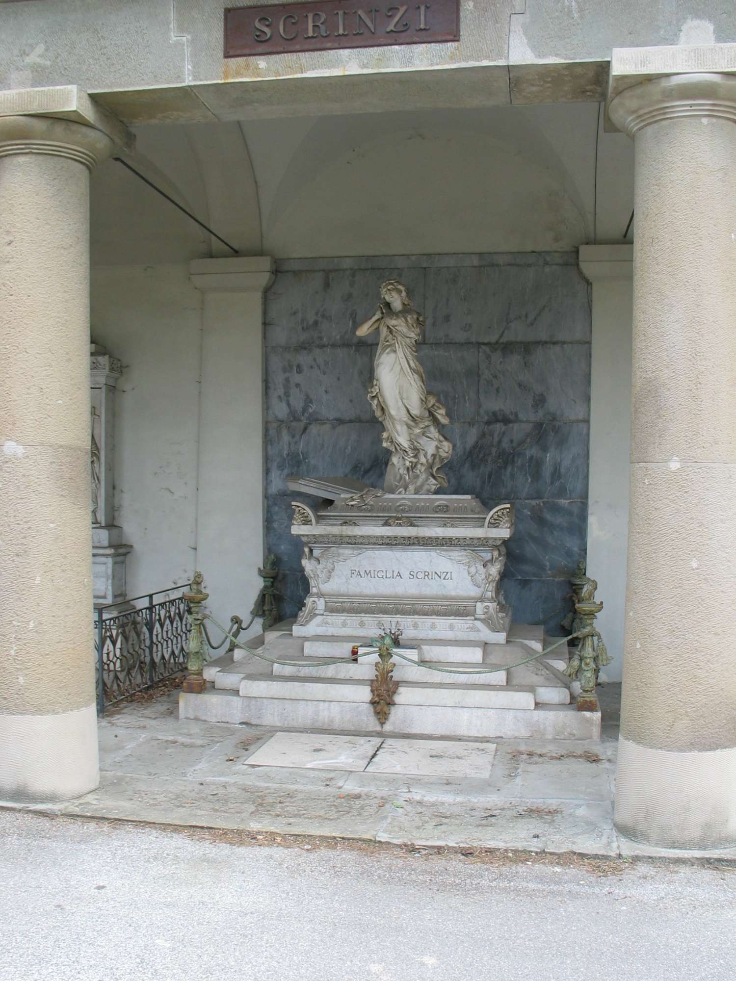 La tomba è stata concessa il 06.11.1872 a Giovanni Battista Scrinzi cavaliere di Montecroce, ed il 23.12.1930 a Olga Marenzi (Archivio Acegas APS). Olga Marenzi, nata Alberti Poja (1866-1957), è figlia di Emma Scrinzi di Montecroce. Il dedicatario, Giovanni Battista barone Scrinzi di Montecroce (Ala 1805 - Trieste 1885), avvocato, fu membro del Consiglio decennale (1850-1860), consigliere comunale (1863-1869), deputato al Parlamento di Vienna (1867-1868) e dal 1872 membro a vita della Camera dei Signori. Cavaliere dell'Impero Austriaco (1850), Barone (1880). Fu stilatore del testamento del barone Revoltella, curò l'istituzione della Scuola Superiore di Commercio (precursore della facoltà di Economia e Commercio), e della Galleria d'arte Revoltella, alla sua morte la casa di proprietà passa alle figlie Emma ed Onorina. Casa Sordina fu realizzata dall'architetto Giovanni Degasperi nel 1855 e il primo proprietario e inquilino fu il Barone Scrinzi, presenta un lussuoso e artistico portone intagliato a rilievo (Fetonte, Minerva, Mercurio), mascheroni sia su corso Saba che su piazza Goldoni e balcone con il monogramma GBS.