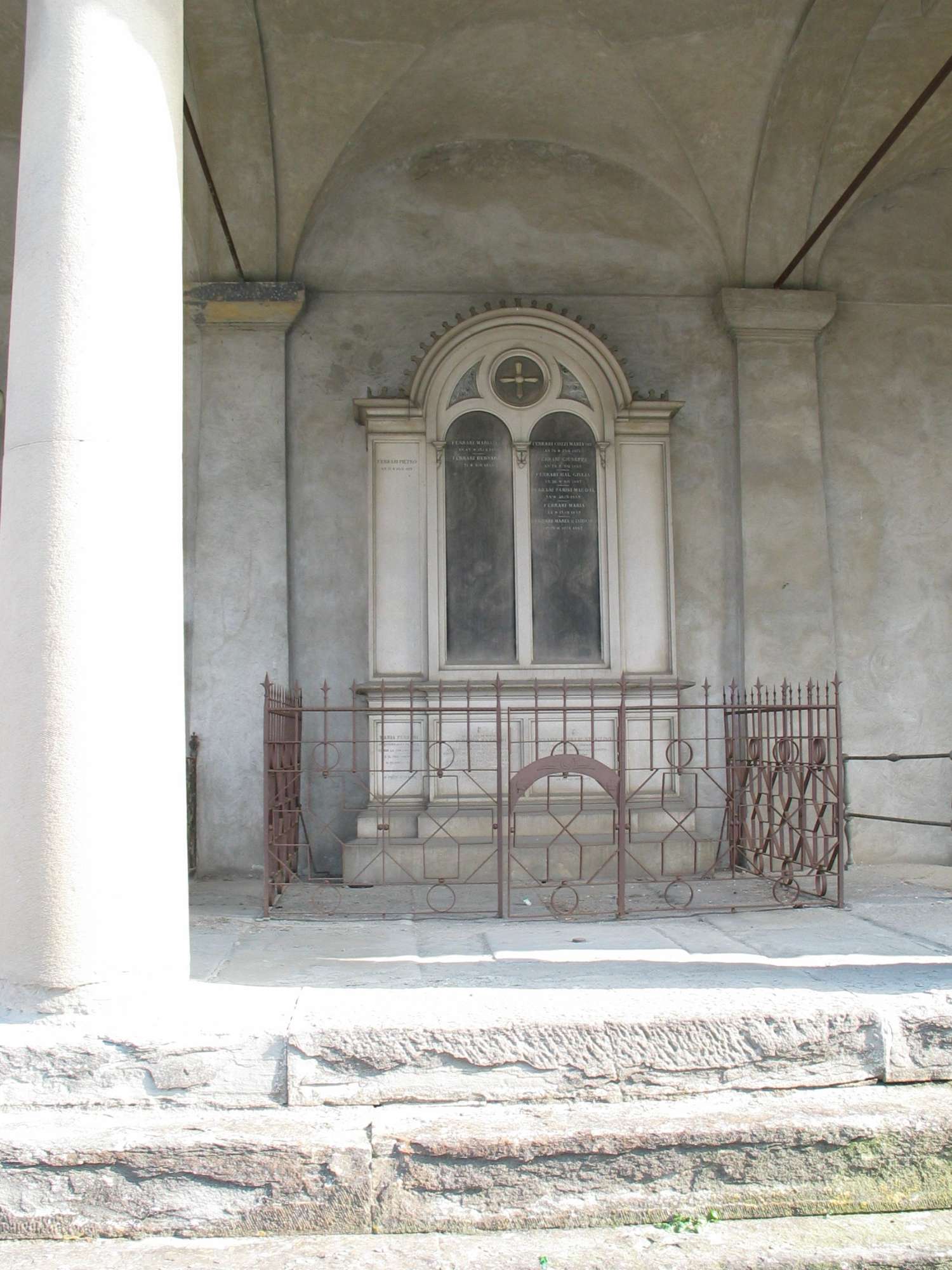 L'edicola in marmo bianco, in forma di serliana, contiene due lastre in marmo nero terminanti ad arco a tutto sesto, sopra cui è un tondo con iscritta una croce greca.