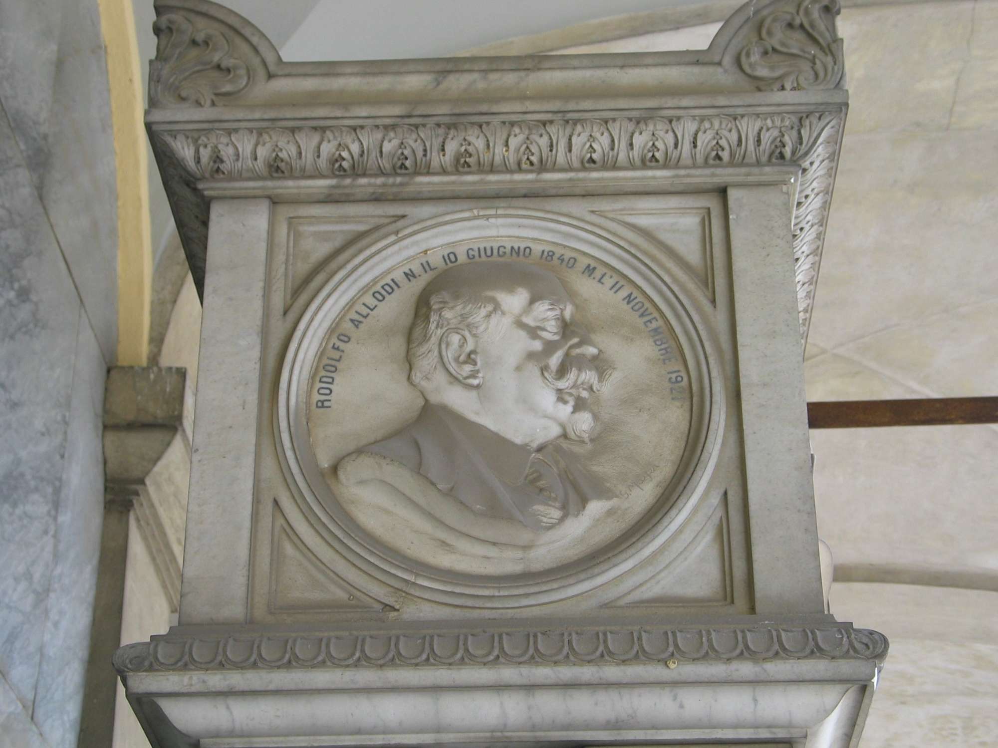 Un sarcofago poggiante su un basamento marmoreo è ornato da quattro tondi con, a bassorilievo, i ritratti dei membri della famiglia Allodi; sul fronte Giusto Giuseppe e Maria con al centro una ghirlanda di fiori, sui lati minori due ritratti maschili. Sulla destra Rodolfo Allodi e sulla sinistra Alberto Allodi.