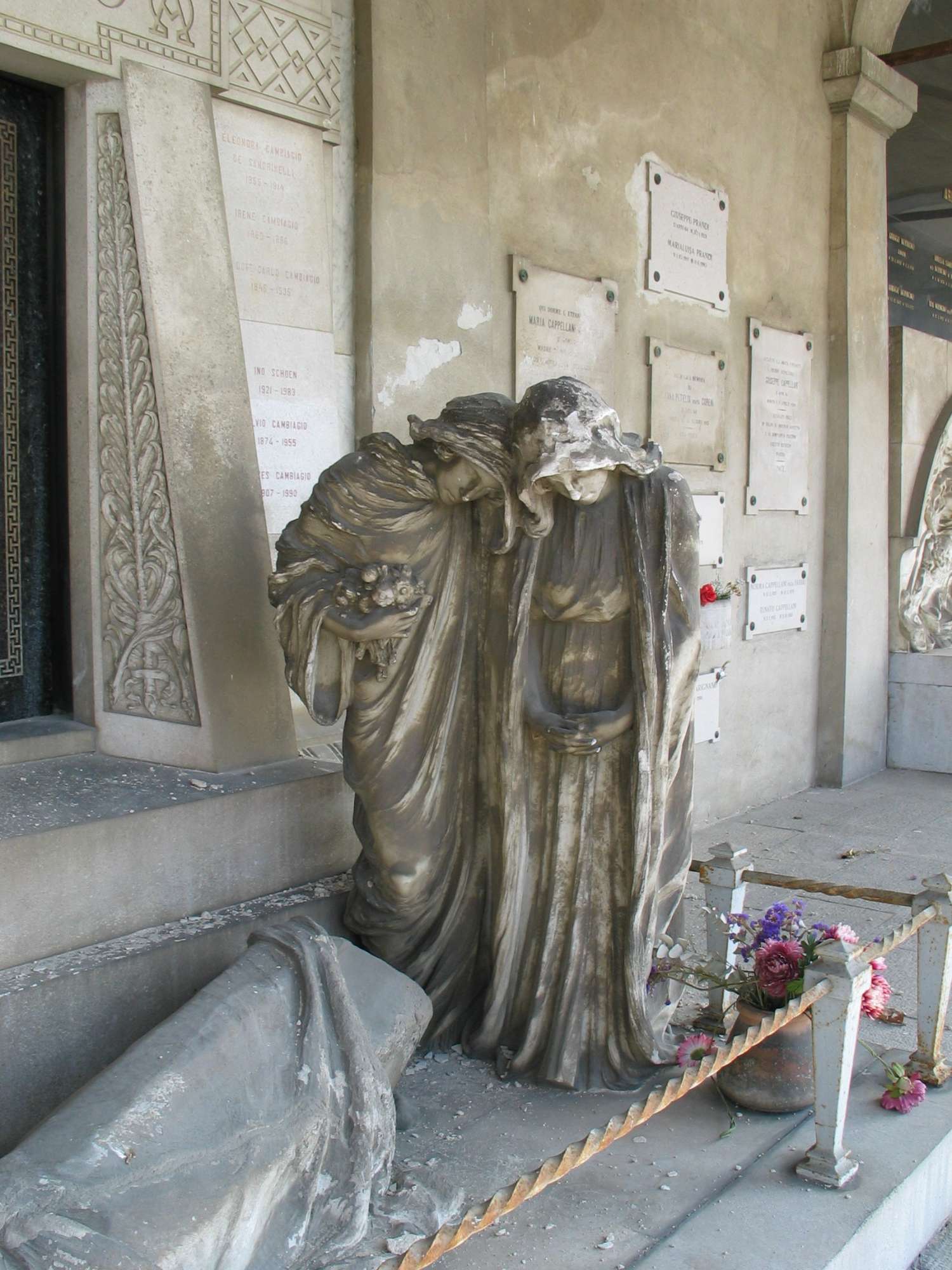 Due figure femminili dolenti, avvolte in lunghi mantelli ed incappucciate, si avvicinano ad una bara appoggiata a terra e coperta da un drappo, l'una recante un mazzo di fiori, l'altra con le mani giunte; sullo sfondo, sopra uno zoccolo, è una porta bronzea fiancheggiata da due colonne in pietra che sorreggono un'architrave con il nome della famiglia; ai lati le lettere alfa ed omega, simboli del principio e della fine.