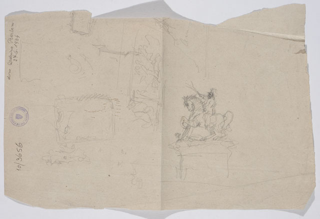 Schizzo del monumento in onore di Vittorio Emanuele II. Sul recto, abbozzo generale del monumento e dettagli architettonici; sul verso, studio per la statua equestre e il suo basamento.