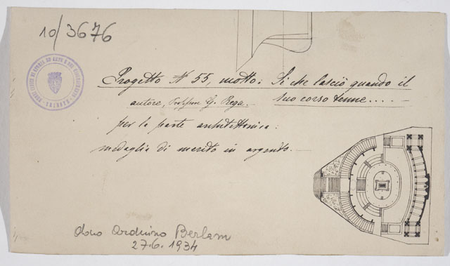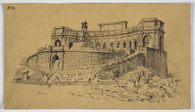 Il disegno è annesso alla serie di studi per il Monumento nazionale a Vittorio Emanuele II, cfr. schede CMSAOAR10_3646-CMSAOAR10_3688, eseguiti da Ruggero Berlam. Egli partecipò al secondo concorso per il monumento a Vittorio Emanuele II a Roma, indetto dal momento che la prima selezione, svoltasi nel 1880, non ebbe un vincitore. Nel primo bando l’unico vincolo posto ai progettisti era stato quello del costo; il secondo, pubblicato il 18 dicembre 1882, prevedeva di collocare il monumento sul colle Capitolino e ne fissava alcune caratteristiche: un fondale architettonico e una statua di Vittorio Emanuele II, dapprima seduto su un trono, poi a cavallo. Secondo Sticotti, Berlam inviò il progetto in incognito da Milano, per non essere riconosciuto come austriaco; ma dopo esser stato esposto a Roma, esso fu fatto sparire, su volontà del primo ministro Agostino Depretis, per non turbare i rapporti che si erano creati con l’Austria. Il concorso, cui parteciparono 98 progettisti, fu vinto da Giuseppe Sacconi, con un progetto che presenta affinità con quello di Ruggero Berlam; secondo classificato Manfredo Manfredi, terzo Bruno Schmitz. In seguito, vi fu un terzo bando ristretto ai primi tre classificati, vinto da Sacconi. Quanto al disegno in esame, si tratta di una copia del progetto N. 55 presentato al secondo concorso dal napoletano Gherardo Angelini Rega, che ricevette una medaglia di merito.