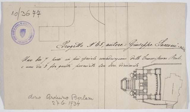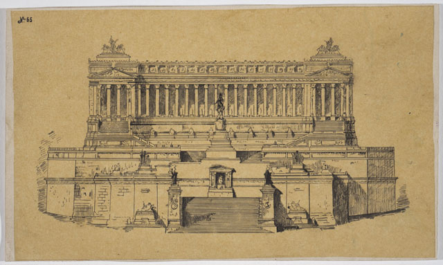Il disegno è annesso alla serie di studi per il Monumento nazionale a Vittorio Emanuele II, cfr. schede CMSAOAR10_3646-CMSAOAR10_3688, eseguiti da Ruggero Berlam. Egli partecipò al secondo concorso per il monumento a Vittorio Emanuele II a Roma, indetto dal momento che la prima selezione, svoltasi nel 1880, non ebbe un vincitore. Nel primo bando l’unico vincolo posto ai progettisti era stato quello del costo; il secondo, pubblicato il 18 dicembre 1882, prevedeva di collocare il monumento sul colle Capitolino e ne fissava alcune caratteristiche: un fondale architettonico e una statua di Vittorio Emanuele II, dapprima seduto su un trono, poi a cavallo. Secondo Sticotti, Berlam inviò il progetto in incognito da Milano, per non essere riconosciuto come austriaco; ma dopo esser stato esposto a Roma, esso fu fatto sparire, su volontà del primo ministro Agostino Depretis, per non turbare i rapporti che si erano creati con l’Austria. Il concorso, cui parteciparono 98 progettisti, fu vinto da Giuseppe Sacconi, con un progetto che presenta affinità con quello di Ruggero Berlam; secondo classificato Manfredo Manfredi, terzo Bruno Schmitz. In seguito, vi fu un terzo bando ristretto ai primi tre classificati, vinto da Sacconi. Quanto al disegno in esame, si tratta di una copia del progetto vincitore, presentato da Giuseppe Sacconi, "caratterizzato da un linguaggio architettonico che interpretava in modo scolastico, ma corretto, gli stilemi classici greco-romani, gli unici – secondo le indicazioni di Camillo Boito – appropriati alla nuova capitale" (Savorra 2017).
