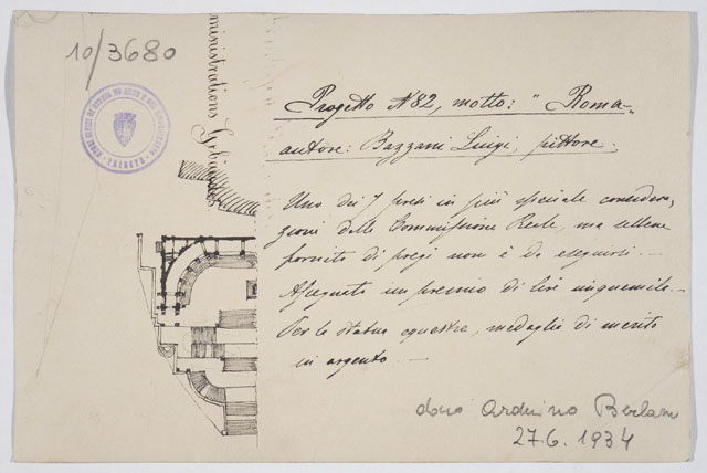 Il disegno è annesso alla serie di studi per il Monumento nazionale a Vittorio Emanuele II, cfr. schede CMSAOAR10_3646-CMSAOAR10_3688, eseguiti da Ruggero Berlam. Egli partecipò al secondo concorso per il monumento a Vittorio Emanuele II a Roma, indetto dal momento che la prima selezione, svoltasi nel 1880, non ebbe un vincitore. Nel primo bando l’unico vincolo posto ai progettisti era stato quello del costo; il secondo, pubblicato il 18 dicembre 1882, prevedeva di collocare il monumento sul colle Capitolino e ne fissava alcune caratteristiche: un fondale architettonico e una statua di Vittorio Emanuele II, dapprima seduto su un trono, poi a cavallo. Secondo Sticotti, Berlam inviò il progetto in incognito da Milano, per non essere riconosciuto come austriaco; ma dopo esser stato esposto a Roma, esso fu fatto sparire, su volontà del primo ministro Agostino Depretis, per non turbare i rapporti che si erano creati con l’Austria. Il concorso, cui parteciparono 98 progettisti, fu vinto da Giuseppe Sacconi, con un progetto che presenta affinità con quello di Ruggero Berlam; secondo classificato Manfredo Manfredi, terzo Bruno Schmitz. In seguito, vi fu un terzo bando ristretto ai primi tre classificati, vinto da Sacconi. Quanto al disegno in esame, si tratta di una copia del progetto N. 82 presentato al secondo concorso dal pittore Luigi Bazzani (Bologna, 1836 - Roma, 1927) che ricevette un premio di cinquemila lire per l'architettura e una medaglia di merito in argento per la statua equestre.
