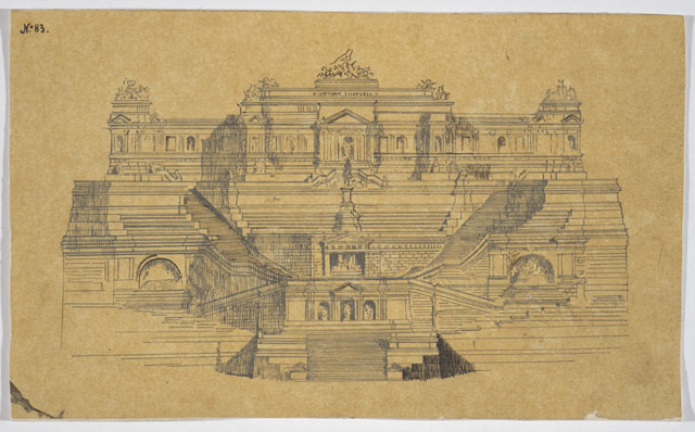 Copia del progetto N. 83 del monumento da erigersi a Roma in onore di Vittorio Emanuele II, su carta da lucido, applicata su carta. Sul verso, semiplanimetria del monumento stesso e tracce di altra planimetria (il foglio è un frammento di riuso).