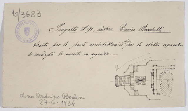 Il disegno è annesso alla serie di studi per il Monumento nazionale a Vittorio Emanuele II, cfr. schede CMSAOAR10_3646-CMSAOAR10_3688, eseguiti da Ruggero Berlam. Egli partecipò al secondo concorso per il monumento a Vittorio Emanuele II a Roma, indetto dal momento che la prima selezione, svoltasi nel 1880, non ebbe un vincitore. Nel primo bando l’unico vincolo posto ai progettisti era stato quello del costo; il secondo, pubblicato il 18 dicembre 1882, prevedeva di collocare il monumento sul colle Capitolino e ne fissava alcune caratteristiche: un fondale architettonico e una statua di Vittorio Emanuele II, dapprima seduto su un trono, poi a cavallo. Secondo Sticotti, Berlam inviò il progetto in incognito da Milano, per non essere riconosciuto come austriaco; ma dopo esser stato esposto a Roma, esso fu fatto sparire, su volontà del primo ministro Agostino Depretis, per non turbare i rapporti che si erano creati con l’Austria. Il concorso, cui parteciparono 98 progettisti, fu vinto da Giuseppe Sacconi, con un progetto che presenta affinità con quello di Ruggero Berlam; secondo classificato Manfredo Manfredi, terzo Bruno Schmitz. In seguito, vi fu un terzo bando ristretto ai primi tre classificati, vinto da Sacconi. Quanto al disegno in esame, si tratta di una copia del progetto N. 91 presentato da Enrico Becchetti che ricevette una medaglia di merito in argento per la parte archiettonica e la statua equestre.