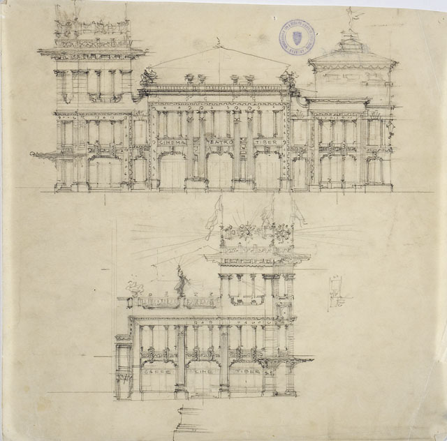 Si tratta di uno dei quattro disegni preparatori appartenenti al progetto architettonico presentato al concorso per il cine-teatro Nazionale da erigersi all'angolo della via Rossetti con il viale XX Settembre, a Trieste, svoltosi nel 1919, con cui Arduino Berlam si aggiudicò il secondo premio, mentre il primo fu conferito all'ing. Allasia (Lettis 1996, p. 208). Il disegno illustra la facciata principale prospiciente su via Rossetti e quella laterale affacciata sul viale XX Settembre (già dell'Acquedotto), dove Berlam aveva previsto un caffé.