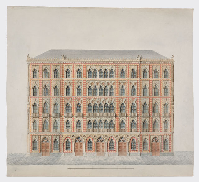 Il disegno in esame appartiene a una serie di tre studi acquarellati, due prospetti e una sezione, per un edificio in stile tardogotico veneziano (cfr. CMSAOAR10_4135- CMSAOAR10_4137). Come messo in luce dalla critica, si tratta con tutta probabilità di elaborati preliminari all’esecuzione di palazzo Gopcevic, realizzato da Giovanni Andrea Berlam nel 1850 su commissione di Spiridione Gopcevic, mercante di origini serbe, a Trieste. Palazzo Gopcevic si caratterizza infatti per lo stesso numero di livelli e di luci per piano e per il medesimo trattamento dell’intonaco di facciata, che, traendo ispirazione dall'architettura quattrocentesca veneziana, rompe con lo stile neoclassico dominante nell’edilizia triestina dell’epoca.