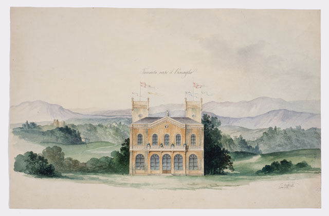 Disegno acquarellato raffigurante prospetto di villino entro un paesaggio. L'edificio, con due livelli sopra il suolo, è scandito da cinque grandi aperture ad arco al piano terreno ed altrettante, di dimensioni minori, al piano superiore, distinto dal primo, attraverso una balaustrata continua, che, nella parte centrale aggettante, si trasforma in balcone. La parte aggettante termina a guisa di frontone con oculo. Il fabbricato è concluso da un'alta cimasa. Sul retro, l'edificio è chiuso da due torri laterali.