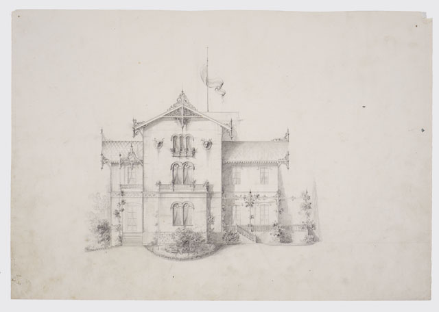Si tratta di un progetto di villino, sviluppato anche in altre due tavole (cfr. CMSAOAR10_4140 e CMSAOAR10_4141), ove elementi di gusto Rundbogenstil sono accostati ecletticamente ad altri propri della casa rustica in legno. Acquistato per le civiche collezioni da Lituano Samero nel 1953, il disegno, sulla scorta di un'iscrizione vergata da mano ignota, è stato attribuito a Giovanni Andrea Berlam.
