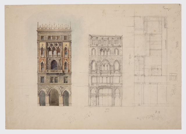 Tavola dedicata alla progettazione di un edificio in stile gotico-veneziano. Presenta uno schizzo della facciata e della sua planimetria, rispettivamente al centro e a destra. A sinistra, una rielaborazione più dettagliata della facciata, eseguita ad acquerello.