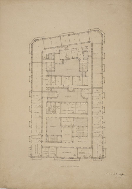 Planimetria del primo piano nobile di un edificio a matita e acquerello, con sezione delle murature tratteggiate. La destinazione dei vani è indicata da iscrizioni. Le zone acquerellate di azzurro corrispondono ai cortili.