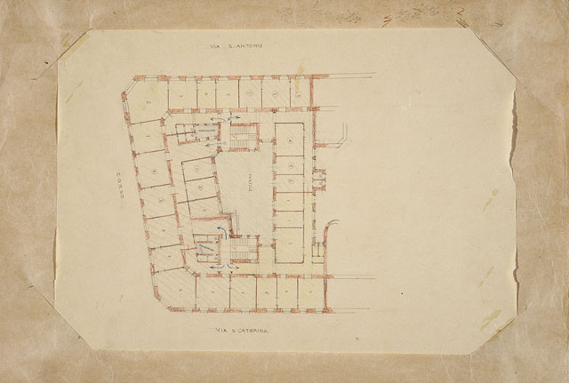 Entro passe-partout, foglio con semi-planimetria del pianoterra di un edificio a matita, con sezione delle murature tratteggiate in colore ocra. I vani sono numerati e ospitano tratteggi di diverso colore. Le zone tratteggiate di azzurro corrispondono ai cortili e alle chiostrine.