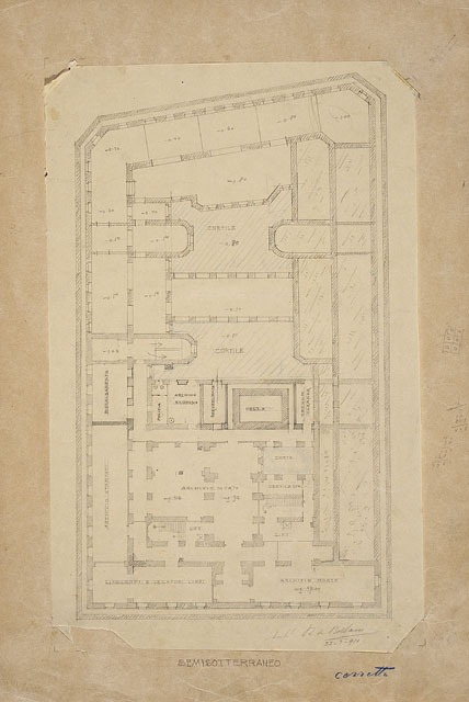 Planimetria del piano semisotterraneo di un edificio, con sezione delle murature tratteggiate. La destinazione dei vani è indicata da iscrizioni. Le zone con tratteggio azzurro corrispondono ai cortili.