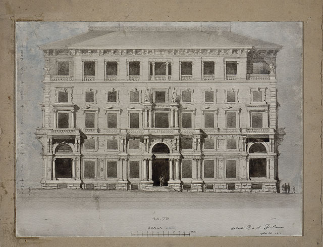 Il disegno in esame appartiene al "Progetto per l'edificio della Riunione Adriatica di Sicurtà", cfr. schede CMSAOAR10_4176-CMSAOAR10_4206. Agli inizi del Novecento il direttore generale della Riunione Adriatica di Sicurtà, Adolfo de Frigyessy, e suo figlio Arnoldo, decisero di realizzare una nuova sede di rappresentanza per la compagnia a Trieste. Acquistato un ampio lotto già edificato tra la piazza Nuova e le vie S. Caterina, S. Antonio e il Corso, e demolite le precedenti costruzioni, indissero nel luglio 1909 un concorso internazionale a inviti per la progettazione di un nuovo palazzo. Oltre a Ruggero e Arduino Berlam, vi parteciparono gli architetti Ignác Alpar, Ludwig Baumann, Max Littmann, Luigi Broggi, Giacomo Zamattio, Giorgio Zaninovich, Enrico Nordio e Ludovico Braidotti. Nel bando si richiedeva che il palazzo contenesse un semi-sotterraneo, un piano elevato, un ammezzato, tre piani superiori più un sottotetto; ma non si davano indicazioni sulla distribuzione interna degli ambienti e su requisiti tecnologici. Nel novembre 1909 la giuria selezionò, tra i progetti pervenuti, quelli di Alpar, Zammattio e dei Berlam (Lettis in Rovello 2007, p. 312) per la seconda fase del concorso. Tuttavia Zammattio e Alpar non si presentarono, cosicché lo studio Berlam, unico rimasto fra i selezionati, ricevette l’incarico. Seguì una fase in cui Ruggero e Arduino Berlam vennero costantemente seguiti dalla committenza nell’elaborazione dell’assetto generale e di ogni minuto dettaglio dell’edificio. La direzione della compagnia assicurativa voleva che lo stabile fosse destinato per metà a sede della società, cioè verso la Piazza Nuova (odierna Piazza della Repubblica); mentre il lato opposto, verso il Corso, fosse adibito a negozi, al pianterreno, e abitazioni. Anche il piano prospiciente la via S. Antonio (attuale via Dante) era riservato agli esercizi commerciali. Il progetto definitivo dei Berlam, datato 2 dicembre 1910, venne approvato dal Magistrato civico il 12 gennaio 1911; il permesso di fabbrica è del 28 giugno 1911. L’Impresa Carlo Bonetti costruì il palazzo, che fu inaugurato il 7 aprile 1914. Si tratta di un capolavoro del tardo eclettismo europeo, in cui si recuperano gli stilemi della tradizione architettonica del tardo Cinquecento. Nel palazzo, articolato in cinque piani, gli architetti si sono rifatti all’architettura “di facciata, ai palazzi italiani del secolo XVI” (Berlam cit. in Lettis in Rovello 2007, p. 313, nota 9). Quanto al disegno in esame, esso illustra una versione della facciata principale, che trova affinità anche con lo schizzo CMSAOAR10_4191 e con il disegno CMSAOAR10_4195; il disegno CMSAOAR10_4197 ne costituisce invece una copia. Secondo Ceiner, si tratta della seconda versione della facciata, proposta dai Berlam, datata 1910 (1995, p. 212). In esso, la fascia che lega il pianoterra e l’ammezzato è scandita da grandi aperture a tutto sesto alle estremità del prospetto, che ripetono l’arcata di accesso all’edificio, segnato da colonne. Al piano nobile, ritmato da finestre architravate e timpanate, l’asse centrale è segnato da colonne binate che sorreggono una trabeazione, sormontata da sculture. All’ultimo livello, terrazze d’angolo fiancheggiano il corpo dell’edificio traforato da aperture delimitate da balaustre; tetto a falde aggettanti. Altri studi per il prospetto principale alle schede CMSAOAR10_4192, CMSAOAR10_4194, CMSAOAR10_4196.