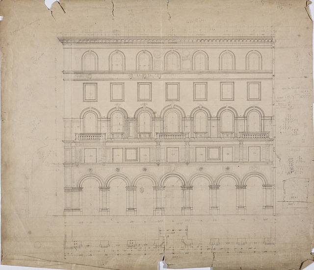 Il disegno fa parte della serie grafica eseguita da Ruggero Berlam per il progetto di una casa di sua proprietà sita in via Giulia 5 - angolo via Piccolomini, Trieste (schede CMSAOAR10_4233 - CMSAOAR10_4239). Si tratta di un edificio d’abitazione, che egli eseguì per profitto, in cui ritorna al linguaggio architettonico rinascimentale, che unisce al recupero del basamento a loggiato di Palazzo Ducale. Inizialmente egli aveva ipotizzato, come si può vedere negli studi grafici, un partito decorativo più ricco (anche cfr. CMSAOAR10_4234) di quello effettivamente realizzato, espresso anche nella ricerca coloristica nel giustapporre parti a bugnato ad altre in muratura (cfr. CMSAOAR10_4235). Tuttavia nelle linee generali il palazzo edificato, considerato dalla critica “la miglior casa per appartamenti e una delle più belle costruite a Trieste alla fine del secolo decimonono” (Pozzetto 1999, p. 110), non si distanzia molto dai progetti grafici. Nel disegno in esame, il palazzo presenta al pianoterra, una sfilata di arconi sorreggenti una teoria di oculi circolari, staccati dal mezzanino con una cornice poco evidenziata. Segue, staccato da un’importante fascia, il piano nobile con finestre e portefinestre (tre i balconi) marcate da paraste con decori a candelabra. Tale decorativismo non interessa le aperture rettangolari nel livello superiore, separate da una larga cornice marcapiano dalle finestre ad arco a tutto sesto con ghiera listellata dell’ultimo livello, sopra le quali si imposta un importante cornicione rinascimentale.