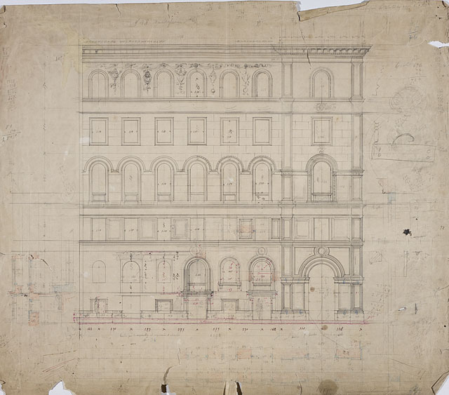 Il disegno fa parte della serie grafica eseguita da Ruggero Berlam per il progetto di una casa di sua proprietà sita in via Giulia 5 - angolo via Piccolomini, Trieste (schede CMSAOAR10_4233 - CMSAOAR10_4239). Si tratta di un edificio d’abitazione, che egli eseguì per profitto, in cui ritorna al linguaggio architettonico rinascimentale, che unisce nel recupero del basamento a loggiato di Palazzo Ducale. Il presente studio, dedicato alla facciata su via Piccolomini, evidenzia l'importanza data da Berlam all'angolo del palazzo stesso, sottolineato da lesene d'angolo, che si contrappone all'apertura di Casa de Leitemburg, sita all'angolo opposto dell'isolato. Per ulteriori notizie storico-critiche su Casa Berlam, si rinvia alla scheda CMSAOAR10_4233.