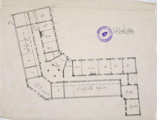 Disegno a matita raffigurante la planimetria del sottotetto di un edificio per l'Istituto Nazionale d'Assicurazione per gli Infortuni sul Lavoro. Studio della distribuzione dell'edificio con definizione della destinazione d'uso (scritte all'interno dei locali).